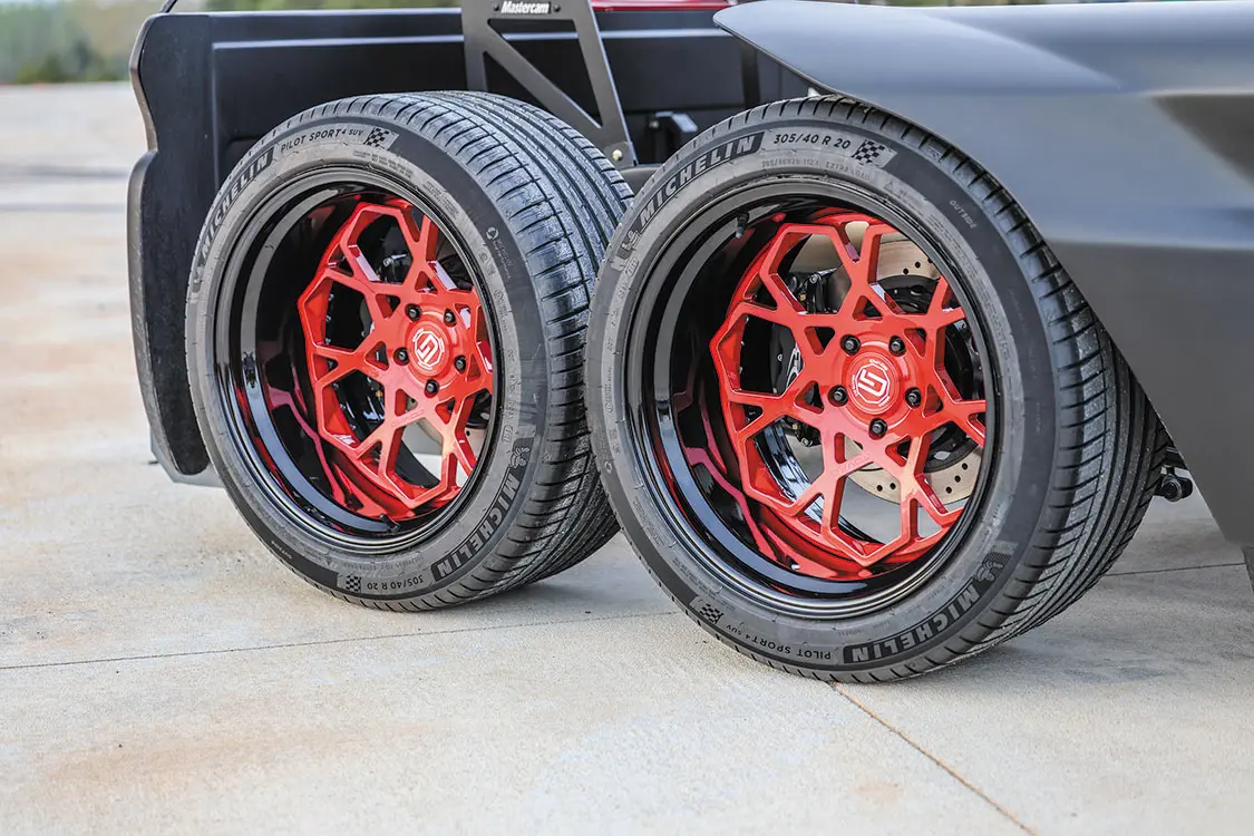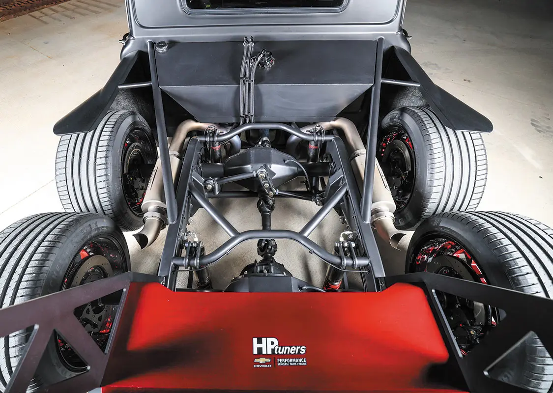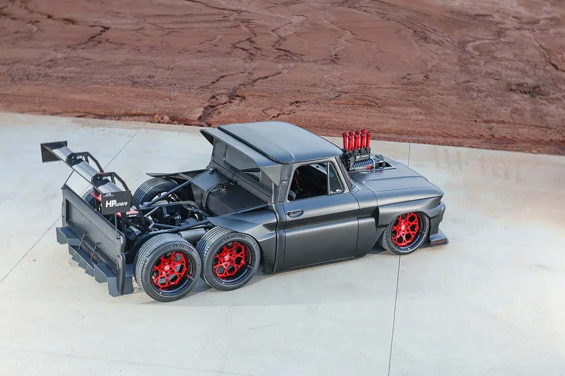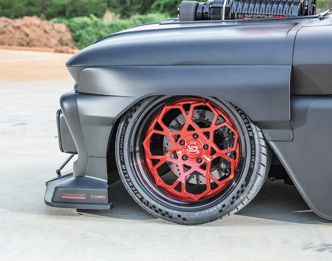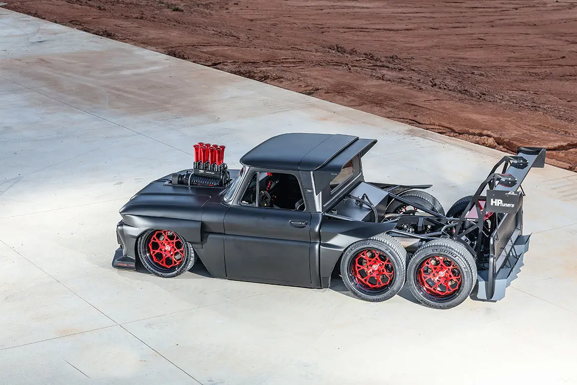 With a little bit of joking around out of the way, the guys started on the build process by requesting the assistance of entrusted Scott’s Hot Rods to fabricate a full custom chassis system that they could fine-tune to jibe with truck’s upcoming dual rear 9-inch pumpkins. Brad first envisioned this project having six wheels, and he never wavered from that initial design even after hearing from every direction just how crazy it was going to be. There was never a doubt in Brad’s mind that Scott’s did deliver on a perfect frame for the C10 complete with a set of Mittler Bros Hydroshox to give the truck 5 inches of adjustability—from an aggressive ride height to low-as-hell parked stance. The wheel selection just had to be killer to fit in with the whole theme of the build, and nothing short of a six-pack of 20-inch Govad G67 wheels wrapped in 275/35/20 Michelin Pilot Sport high-performance tires would do the trick.