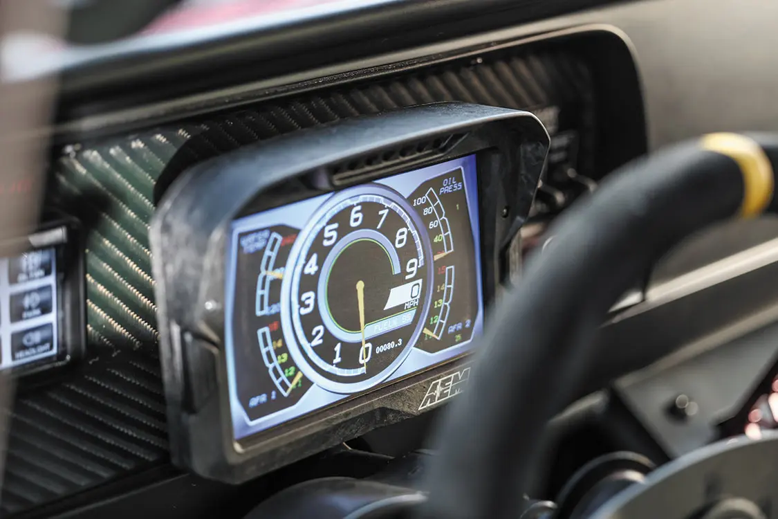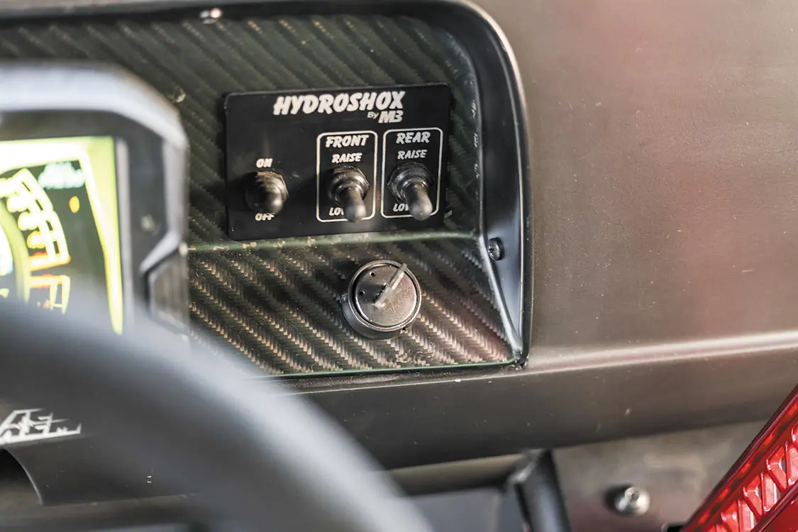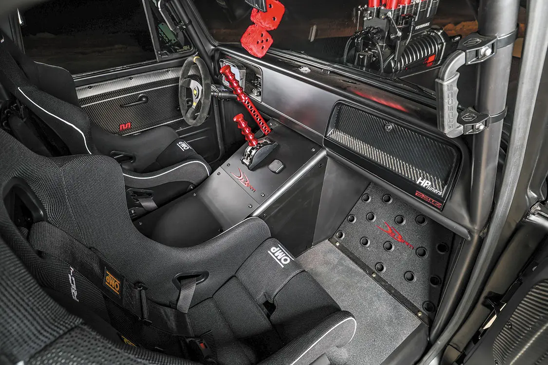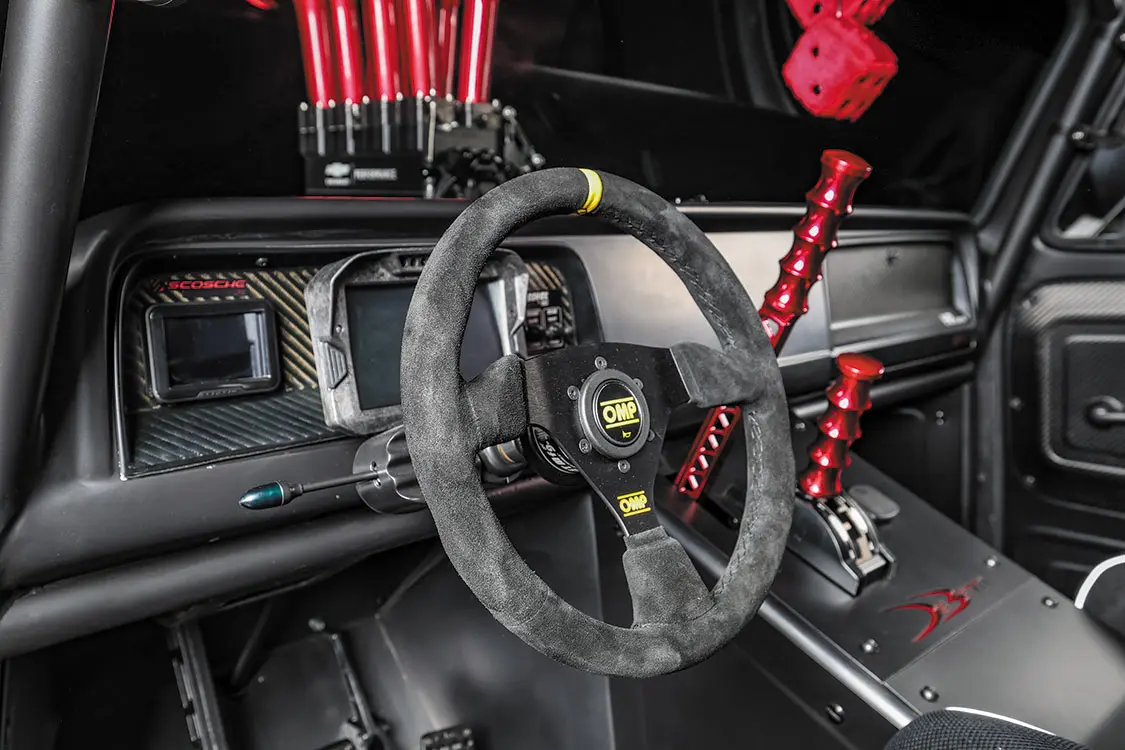 Inside the cab, you’ll notice the freshly built floor pan, as well as a transmission tunnel that was constructed to sit higher than usually in order to house the shifter at an ideal height. OMP Racing Seats and steering wheel were added to give the Slayer the comfort and performance that this style of truck demands. The factory dash has been kept to maintain a level of period correctness, while the digital AEM instrumentation and Scosche M8RX1 8-channel relay switch systems give the DeBerti boys state-of-the-art tech control over the truck’s ignition and other important functions.