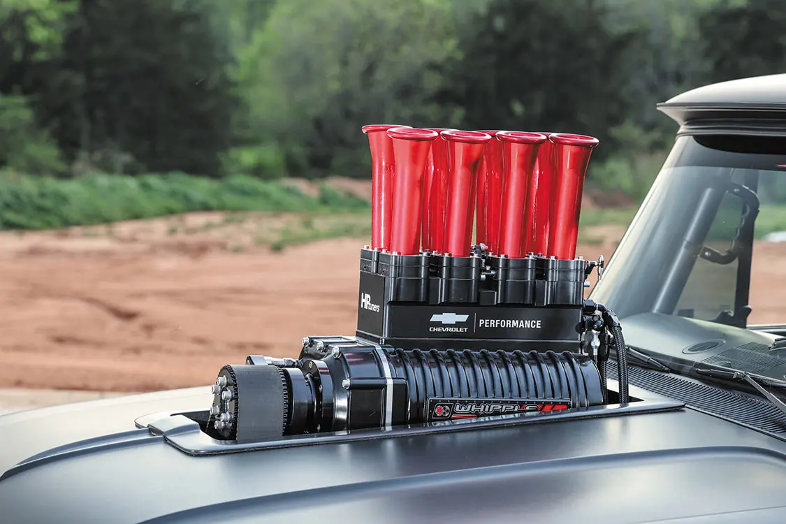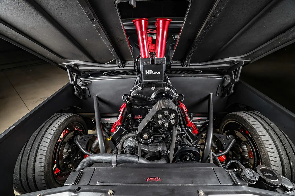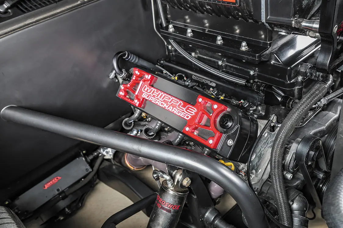 After jumping on the opportunity to collaborate with Chevy Performance on the B-15 engine, the guys soon lined up a Whipple blower to add to the mix. After that, an extra fuel-injected 8-stack served as the cherry on top of this supercharged slice of cake, and with the assistance from HP Tuners, the team was able to dial in the factory ECU to run smoothly—exactly the way the guys were hoping for. Maybe “smooth” isn’t the right word, as the healthy revving sound is damn near frightening. From the engine back, a 4L80 auto transmission with manual valve body from Auto Transmission Design makes both cruising and shredding driving scenarios possible on any given whip around the block.