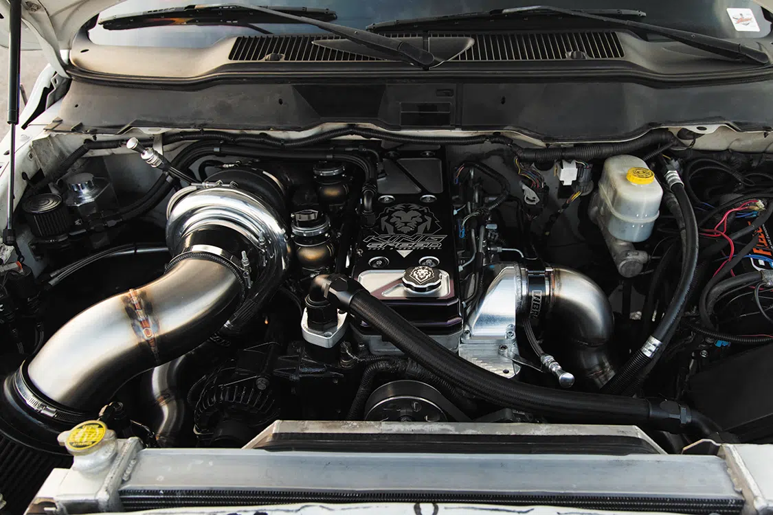 Putting massive amounts of power to the pavement is the first objective of any competitive diesel, and Daniel accomplished this for his truck starting with a swapped 6.7L Cummins inline-six. On top of that sits a large single S485 turbo from Stainless Diesel pro Johnny Gilbert.