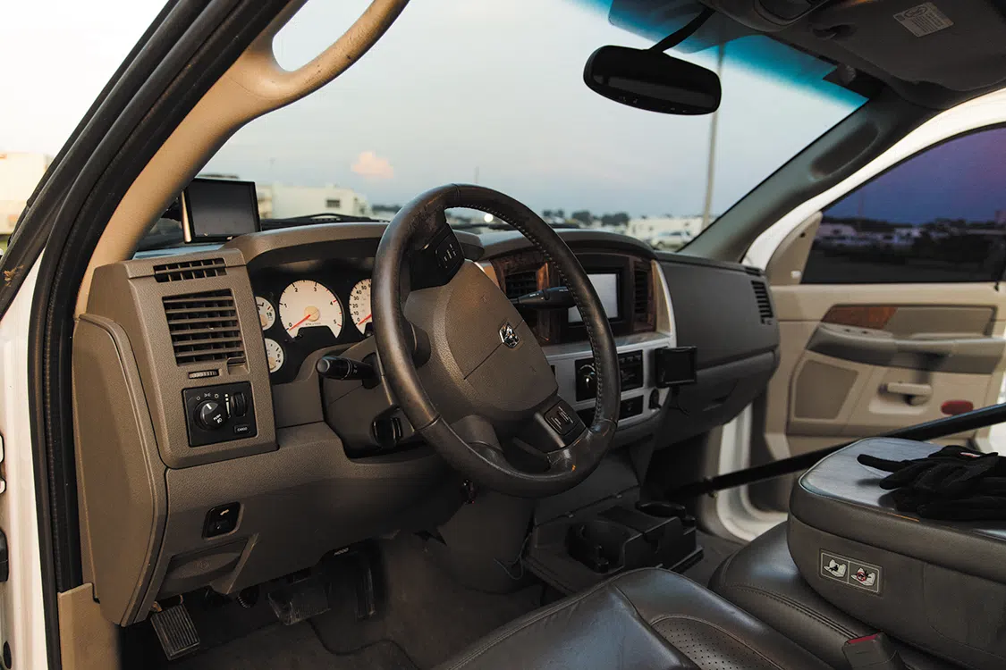When it comes to body and interior modifications to the truck, Daniel opted to do very little, wanting to keep his truck as versatile as possible. Outside, the truck maintains its original white paint, chrome trim, badges and bed. Inside, the truck maintains a similar factory look, right down to the standard heated leather seats, intact heating and air conditioning system, and even a functioning back seat thanks to the singular interior addition – a full rollcage built by Paul Cato of Maverick Diesel, which has removable tubing in the rear section.
