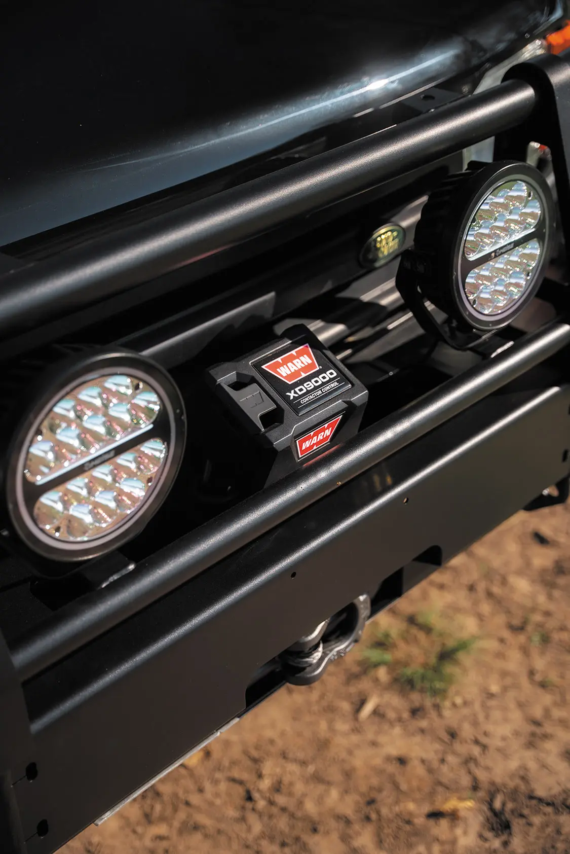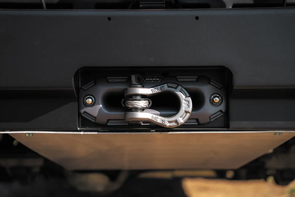 “Below the chassis, custom skid plates built by Ryno safeguard the underside of the WARN winch and front of the engine from damage on and off the trail.”