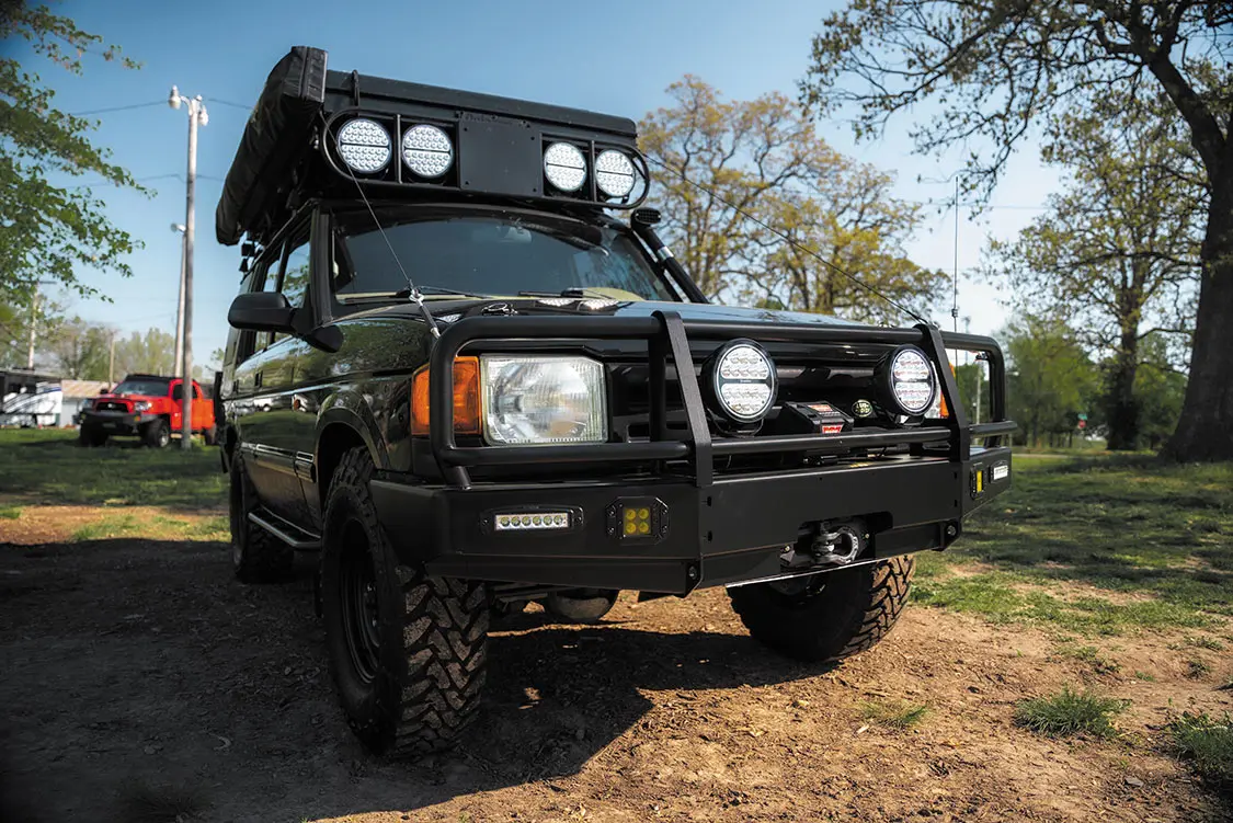 Built to go places in the Ozarks where Ryno’s van can’t go, the first-gen Discovery received a number of suspension upgrades to increase its capabilities once it leaves the pavement. This includes a plethora of components from Ironman 4×4 tied to the SUV’s powdercoated frame in the form of front and rear springs, Foam Cell Pro shocks, and a stabilizer bar.