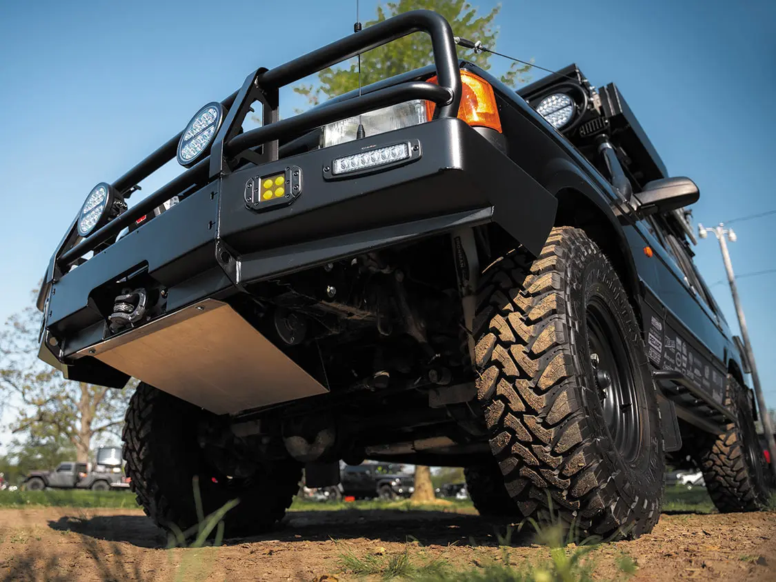 Put together, the Ironman 4×4 America suspension system gives the Land Rover a 2-inch suspension lift. Below the chassis, custom skid plates built by Ryno safeguard the underside of the WARN winch and front of the engine from damage on and off the trail.