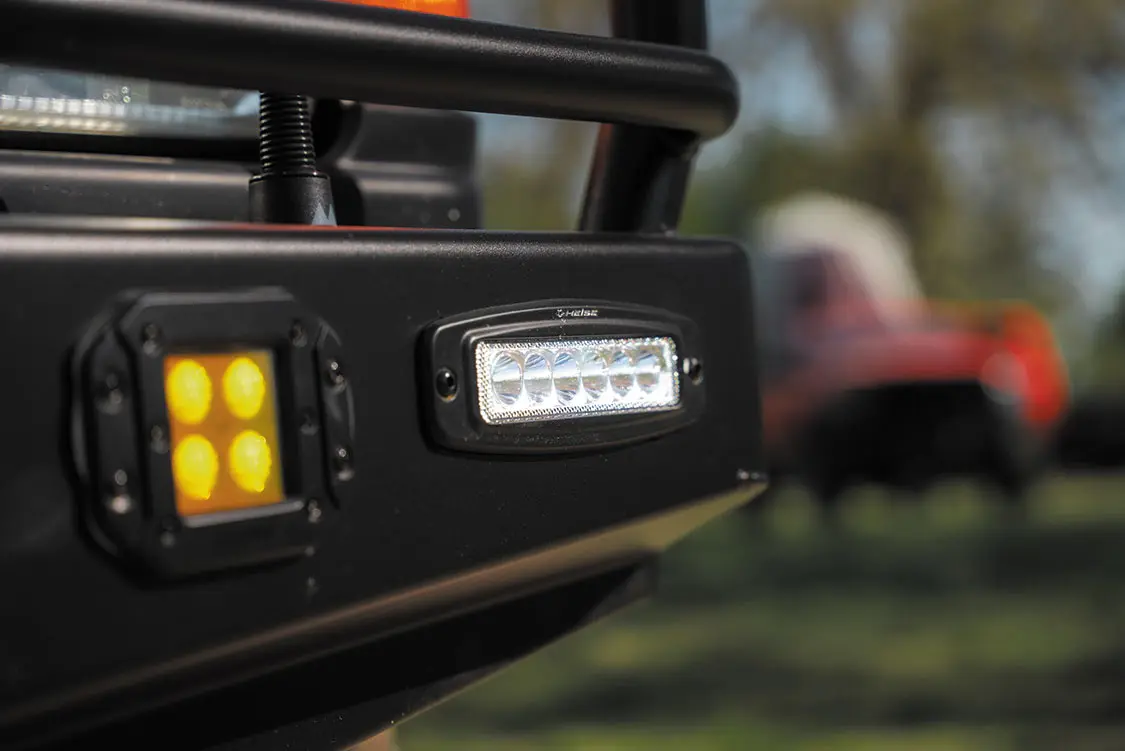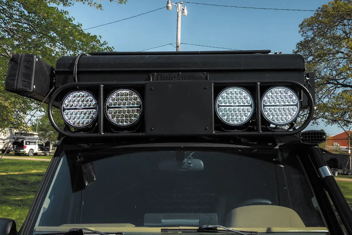 Resprayed in factory black, the Discovery is stunning with a satin black hood center and a lower-quarter graphics wrap done by Precision Signs, featuring all of the component manufacturers used in the build. Both front and rear of the Rover are outfitted with ARB bumpers for looks and body protection, while the camel cut wheelwells make for expertly fit wheels and tires. Secondary lights from Heise sit proudly on the custom roof rack above the Discovery’s cab for added illumination as well as out back for reversing visibility. Combined with the upgraded LED headlights, this sets the Rover up nicely for even the darkest of off-road trail riding.