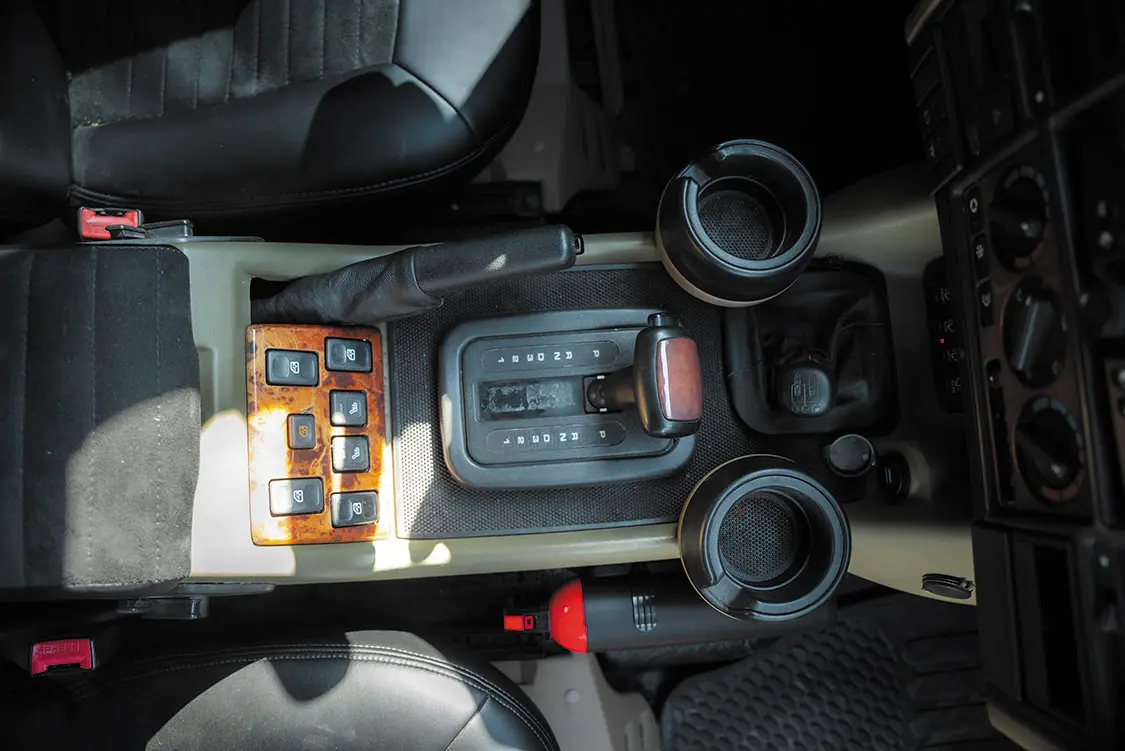 Powering the Discovery is the Rover’s factory 4.0L V-8 engine rebuilt by ReRover, which features reconditioned connecting rods, aftermarket pistons, and a “spicy” camshaft, according to Ryno. The engine was also fitted with a 2.5-inch two-into-one exhaust system from Wyland Muffler, as well as a snorkel for adventures that take the Discovery through deeper water.