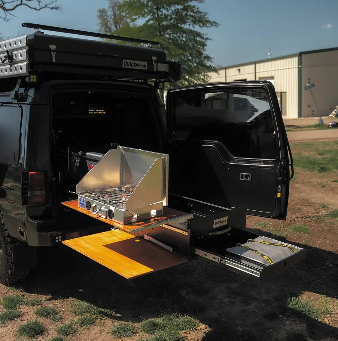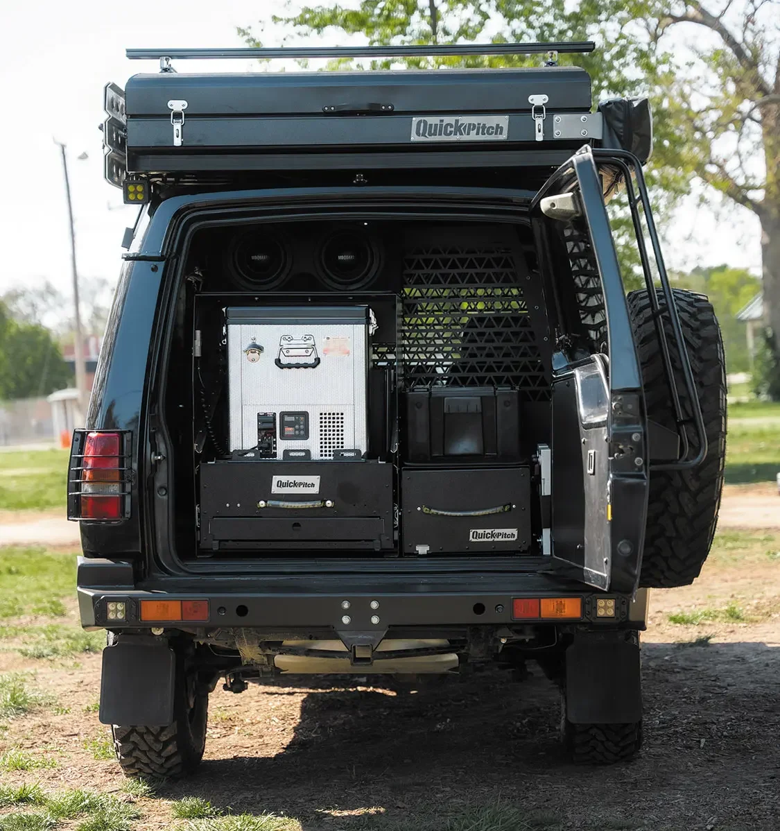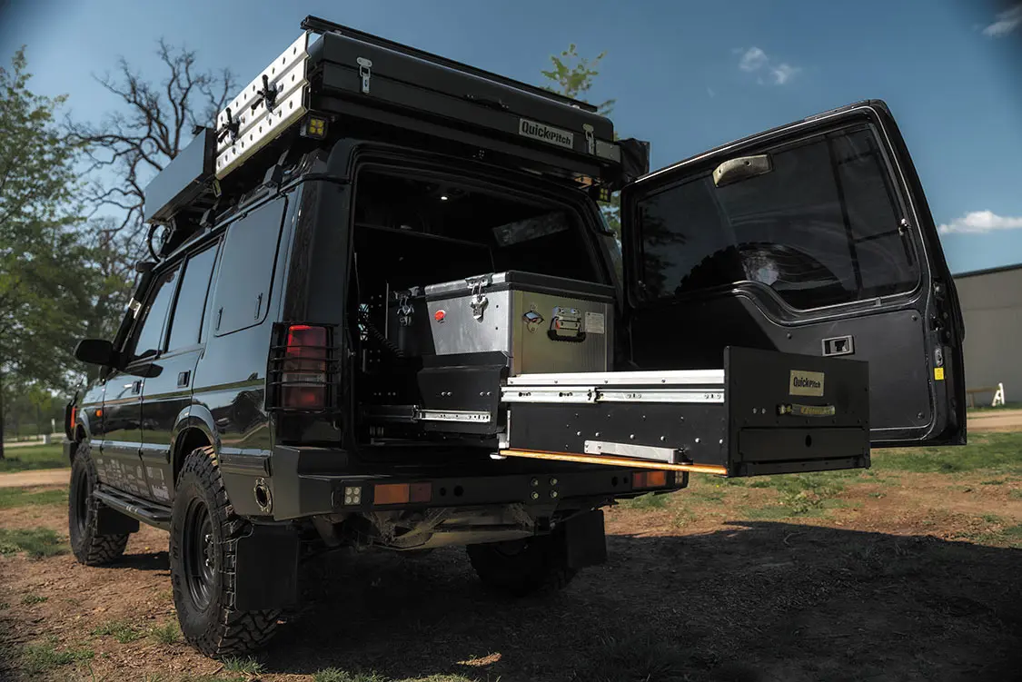 In the rear passenger compartment, Ryno took out the Discovery’s rear seats and added a custom dog enclosure, complete with cargo barriers, window guards, and a built-in window fan for his K9 companion. In the back of Rover, a Quick Pitch USA drawer system, as well as an on-board refrigeration unit, were added, outfitting the SUV with added storage optimization, as well as ample cooking and prep surfaces. You’ll also find the Rover’s expertly-contained bank of XS batteries tucked neatly inside the rear door.