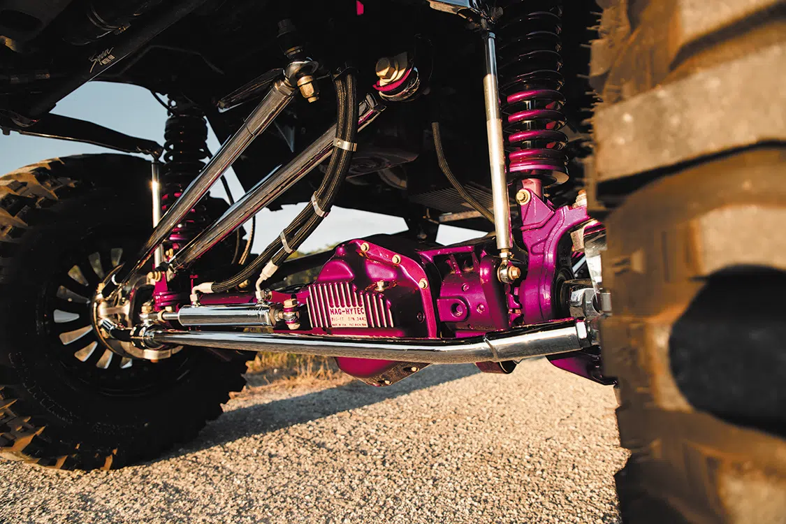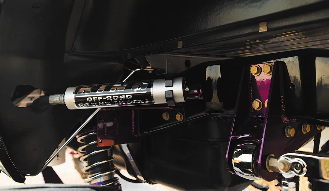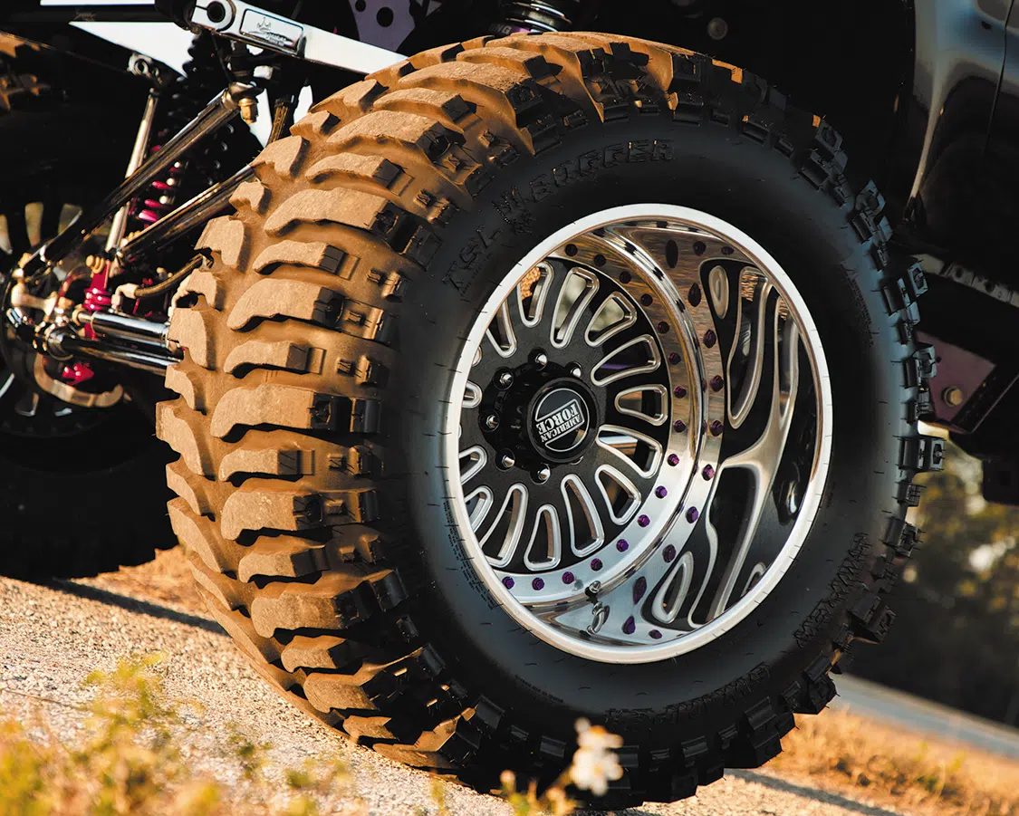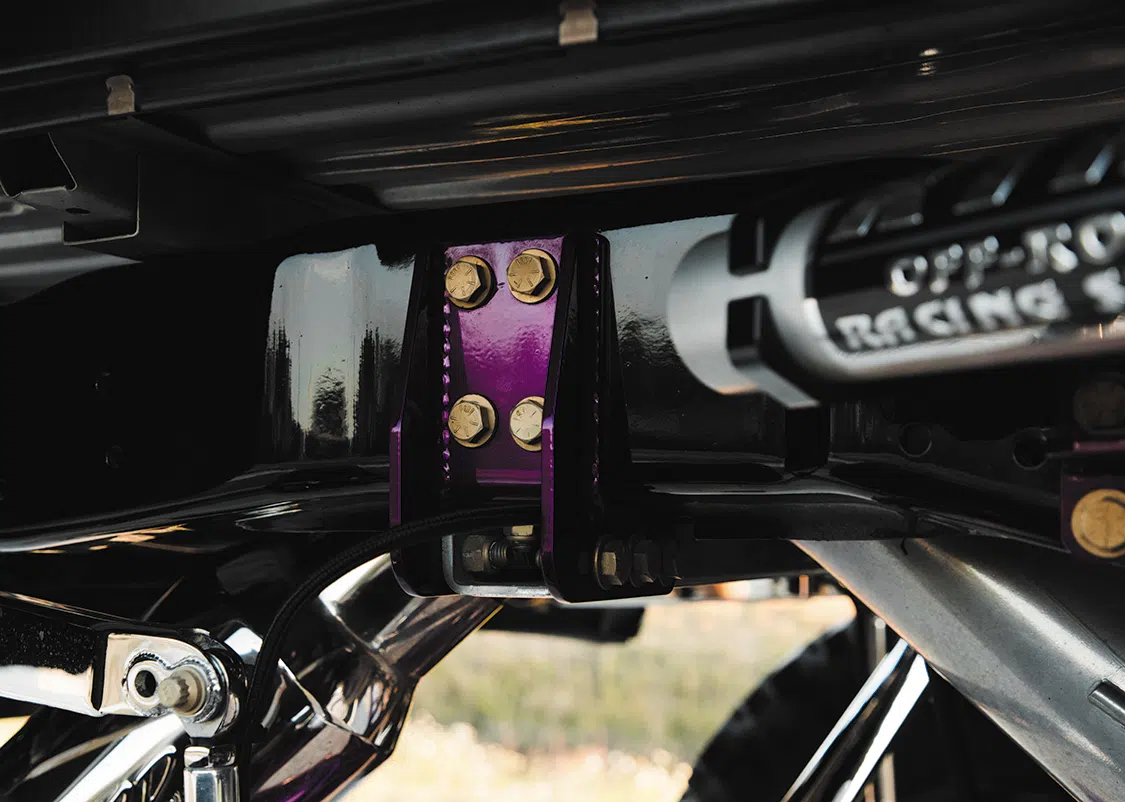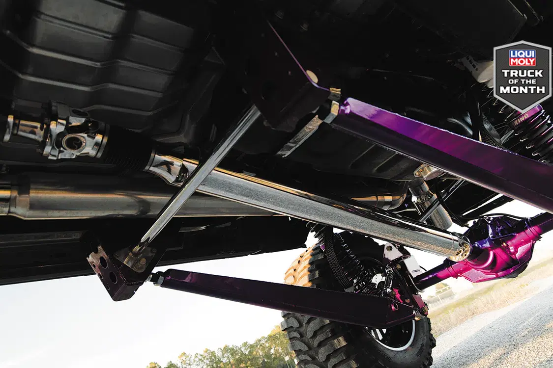 For starters, the truck was taken down to the frame to smooth and paint the entire chassis which was done by Caleb in his shop. He then threw it on a 16-inch long travel Precision Metal Fab lift complete with King 3.0 coilovers, which are all of course powder coated, or chrome plated. A closer inspection will reveal that even all of the hardware has been chrome plated as well, including the smoothed FK rodends and 3.0 Ballistic joints and bushings. It really is quite the spectacle, hanging out under the truck on the photoshoot was like being a kid in a toy store. No matter where you looked there was something to hold your attention. The steering was upgraded with a Precision Steering Components Ram Assist stabilizer, which, you guessed it, has been chrome plated! Now of course the wheels were given the over-the-top treatment.; The very rare two-piece 24×18 American Force MP Series Octane wrapped in 44 inch Interco Boggers have black faces, polished windows, polished lips and purple hardware.