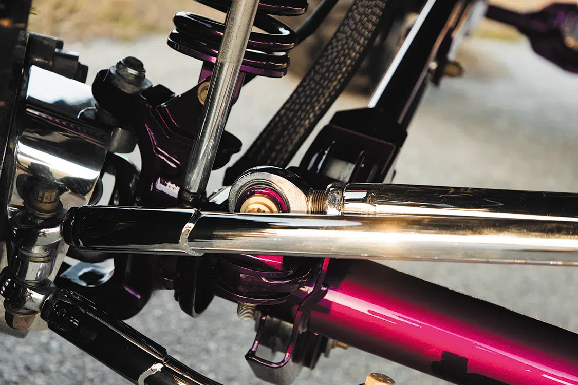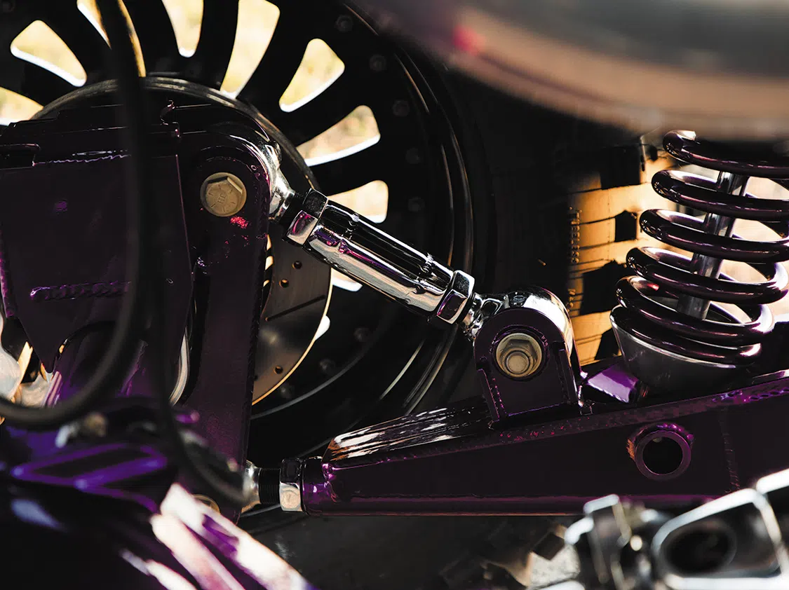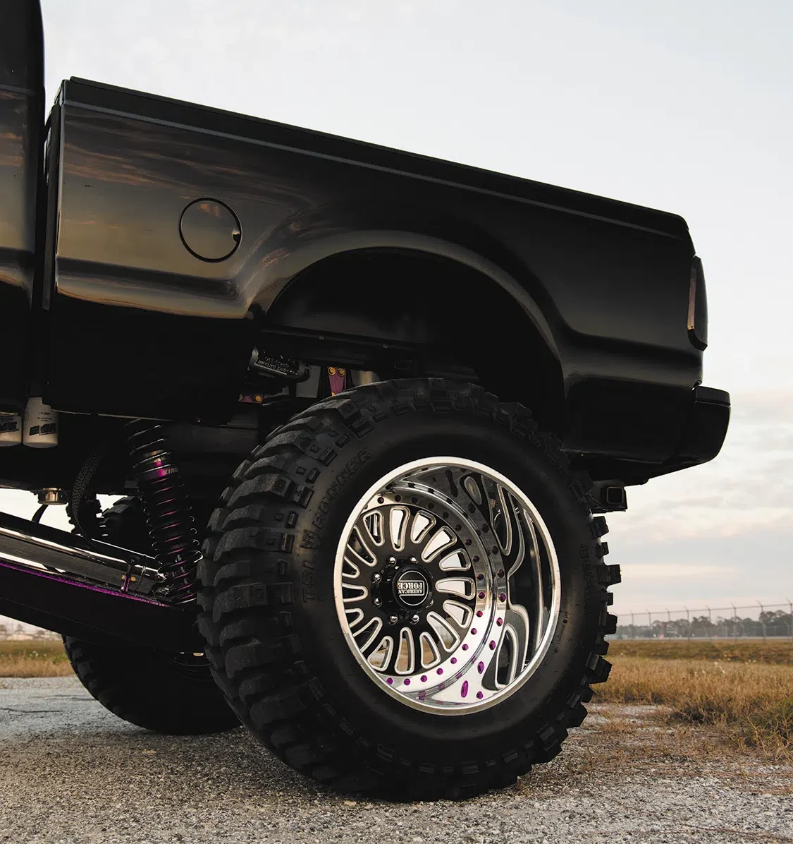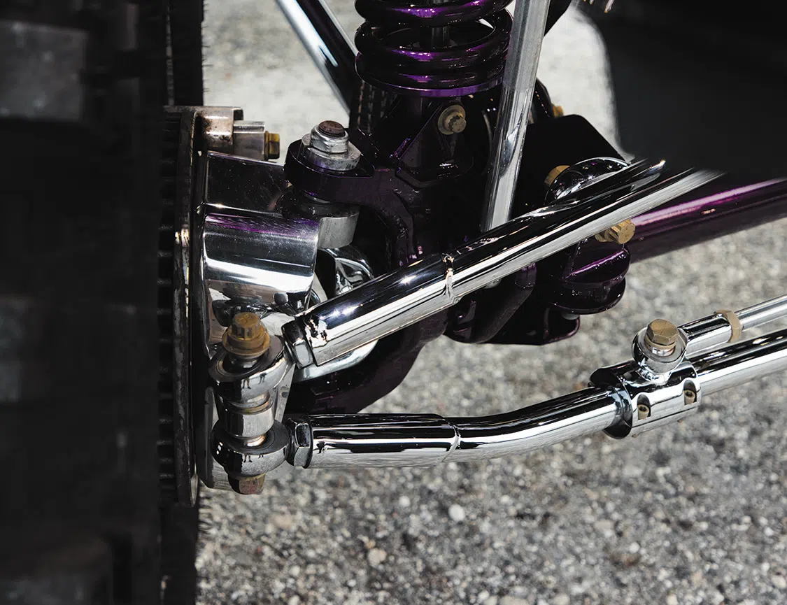 For starters, the truck was taken down to the frame to smooth and paint the entire chassis which was done by Caleb in his shop. He then threw it on a 16-inch long travel Precision Metal Fab lift complete with King 3.0 coilovers, which are all of course powder coated, or chrome plated. A closer inspection will reveal that even all of the hardware has been chrome plated as well, including the smoothed FK rodends and 3.0 Ballistic joints and bushings. It really is quite the spectacle, hanging out under the truck on the photoshoot was like being a kid in a toy store. No matter where you looked there was something to hold your attention. The steering was upgraded with a Precision Steering Components Ram Assist stabilizer, which, you guessed it, has been chrome plated! Now of course the wheels were given the over-the-top treatment.; The very rare two-piece 24×18 American Force MP Series Octane wrapped in 44 inch Interco Boggers have black faces, polished windows, polished lips and purple hardware.
