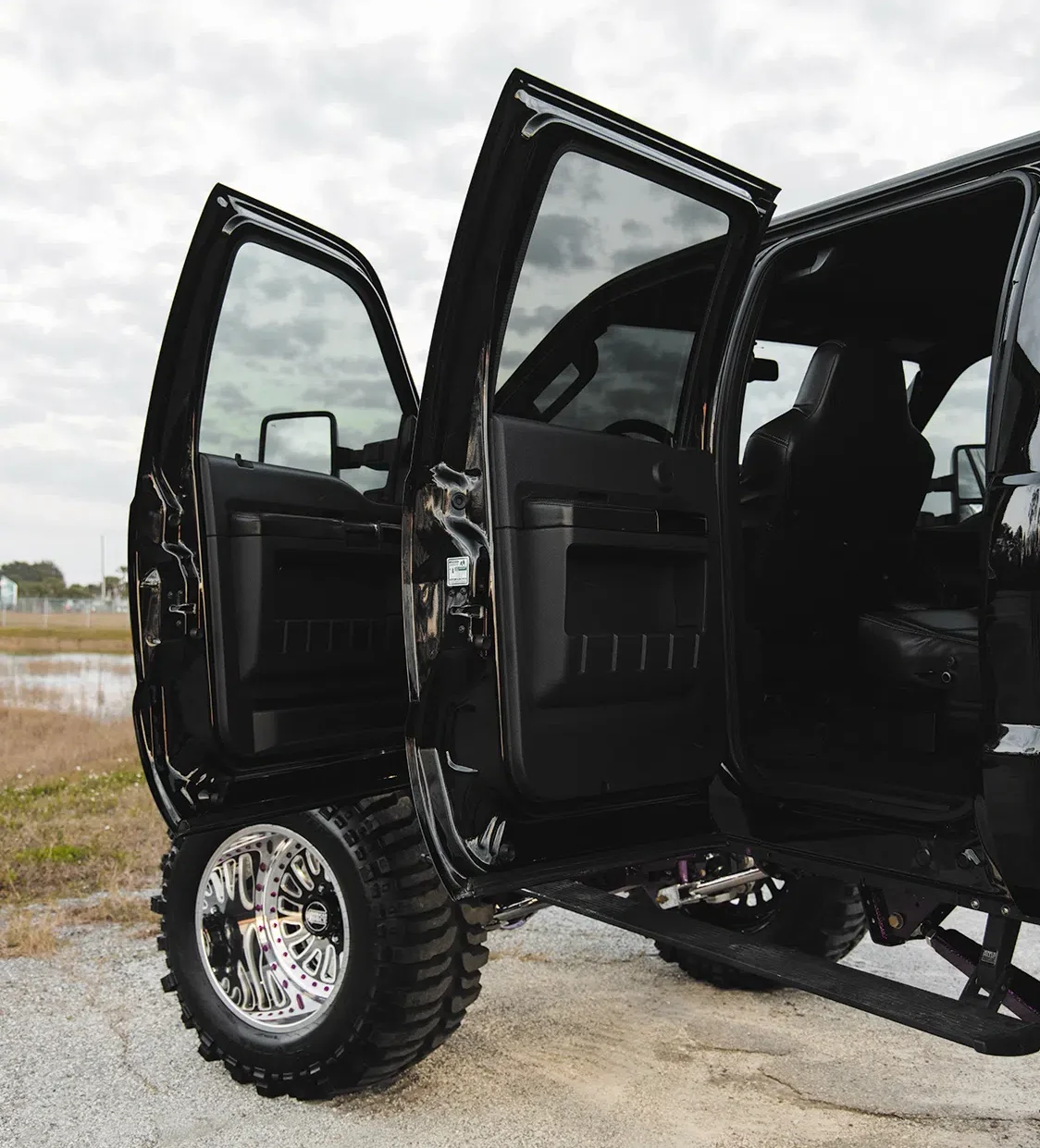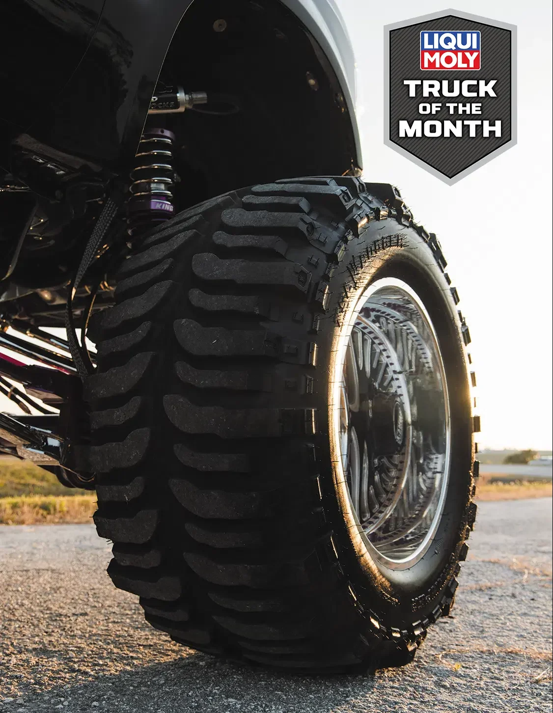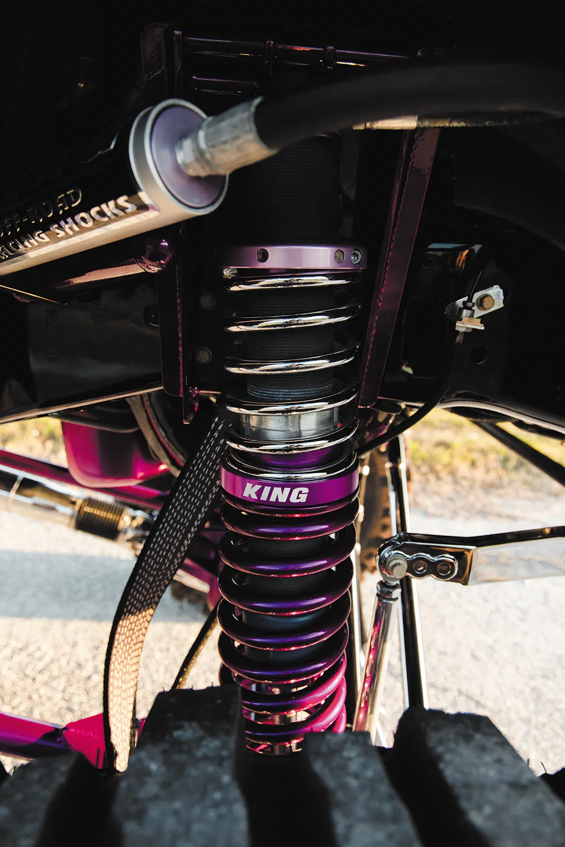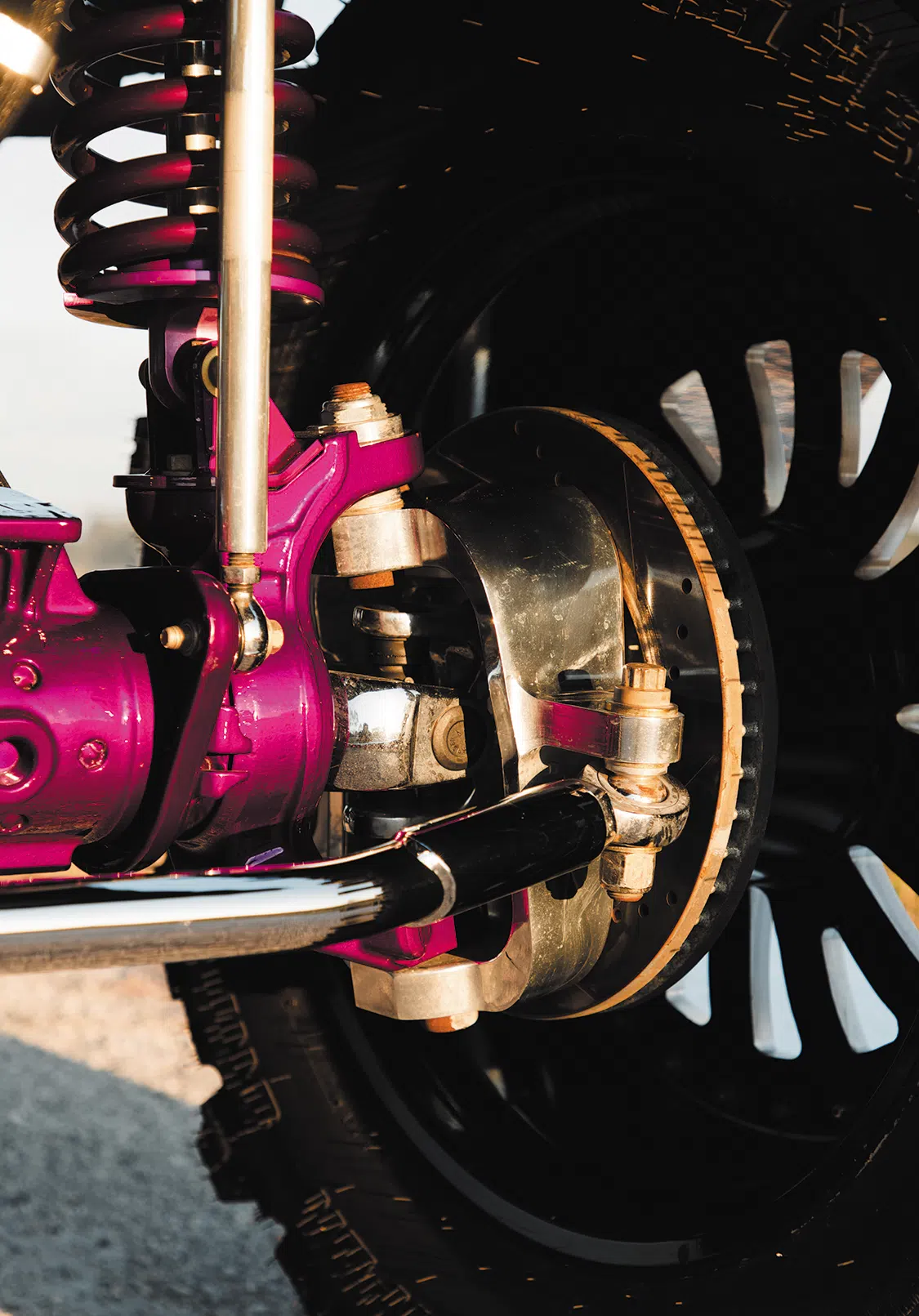 For starters, the truck was taken down to the frame to smooth and paint the entire chassis which was done by Caleb in his shop. He then threw it on a 16-inch long travel Precision Metal Fab lift complete with King 3.0 coilovers, which are all of course powder coated, or chrome plated. A closer inspection will reveal that even all of the hardware has been chrome plated as well, including the smoothed FK rodends and 3.0 Ballistic joints and bushings. It really is quite the spectacle, hanging out under the truck on the photoshoot was like being a kid in a toy store. No matter where you looked there was something to hold your attention. The steering was upgraded with a Precision Steering Components Ram Assist stabilizer, which, you guessed it, has been chrome plated! Now of course the wheels were given the over-the-top treatment.; The very rare two-piece 24×18 American Force MP Series Octane wrapped in 44 inch Interco Boggers have black faces, polished windows, polished lips and purple hardware.