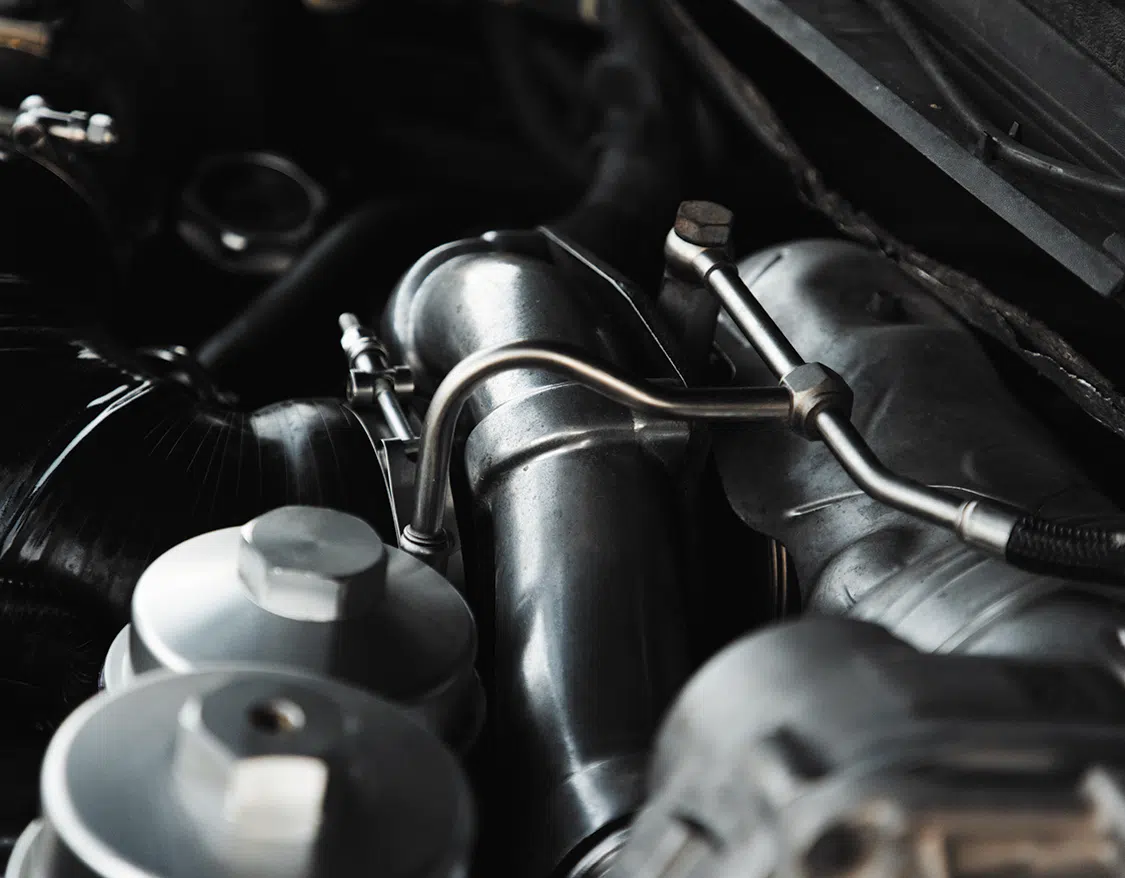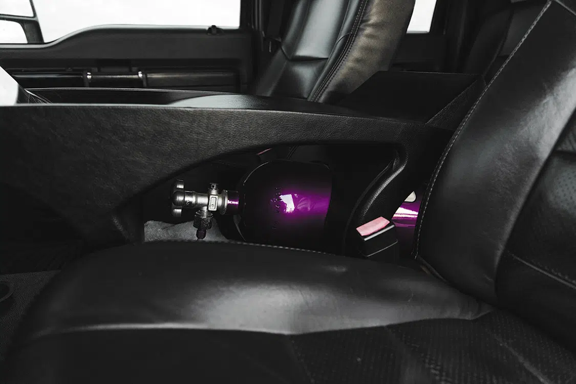 The 6.4 engine has been entirely built up by Performance Machine & MFG. They coated and de-lipped the pistons, put in ARP bolts and head bolts, a polished crank, and bored the motor by .020 inches. There’s a stage 2 Comp Cams camshaft with 188-inch lift and 206-inch duration. The factory heads have been ported and polished, the factory intake has been ported, and it has an Industrial Injection fuel injection system paired with a FASS fuel system. A gnarly compound turbo kit featuring a 59mm and a 76mm turbo fills up the engine bay, getting properly cooled by a Mishimoto radiator and a Spearco Intercooler. A Zex Pro Street nitrous kit finds itself under the center console for whenever you want a powerful shot of juice to drag anybody. Caleb had ATF Speed throw in an ATF Speed 5r110 transmission with a Suncoast Performance torque converter to properly put the power down, and those too have been given the full powder coat treatment to match everything else.! A billet input shaft, billet output shaft, and a billet overdrive planetary plus a polished front and rear drive shaft with solid billet flanges make literally every single visible component ridiculously shiny and clean. Stopping this monster is a set of brakes from SSBC USA with EBC rotors, and those too match the suspension!