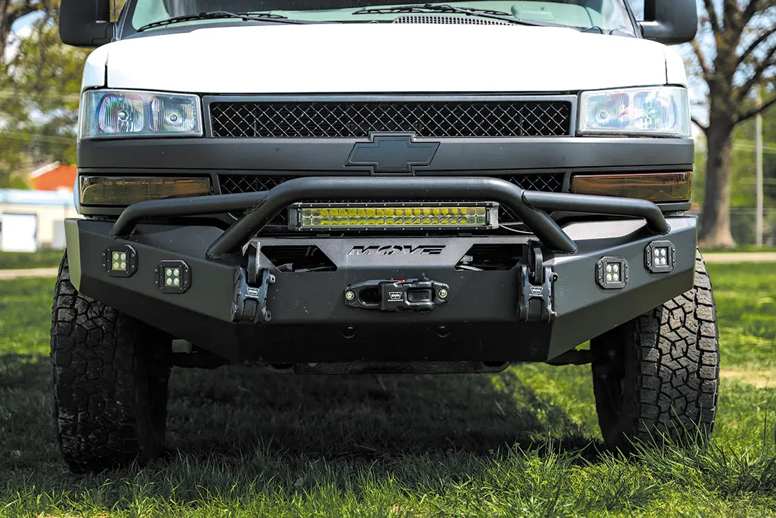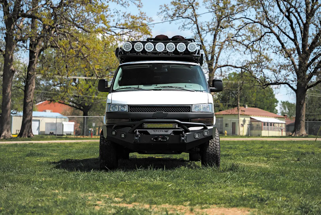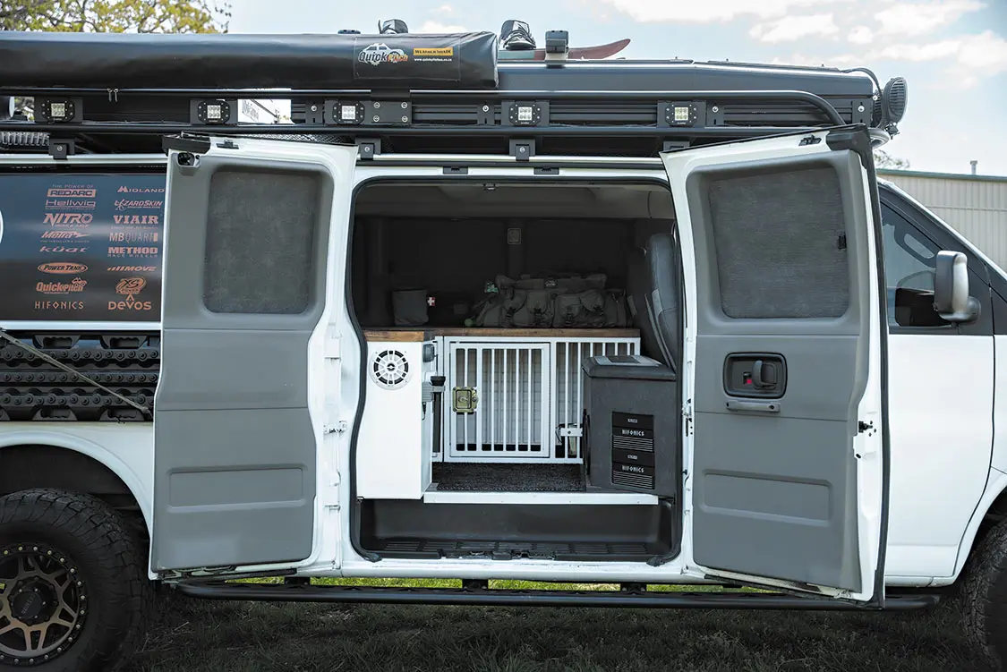 Since the Express is Lieberman’s daily driver, and he has K9 pals with him more often than not, lots of thought went into designing the van to be as safe and practical as possible, not sacrificing on either front. Between its totally custom interior and bulked-up exterior, this van is truly ready for anything. At its base, Method Race Wheels 312s wrapped in 17-inch Toyo Open Country A/TIII tires keep everything rolling smoothly. Rear lift springs and front coils elevate the suspension, paired with trimmed fenders and a relocated bumper, give the van enough clearance to handle any obstacles it encounters with ease. In the event of a mishap or rougher terrain, Viair onboard air is available, located in the factory spare tire well. Safety upgrades on the interior also include custom crates for Lieberman’s K9 companions.