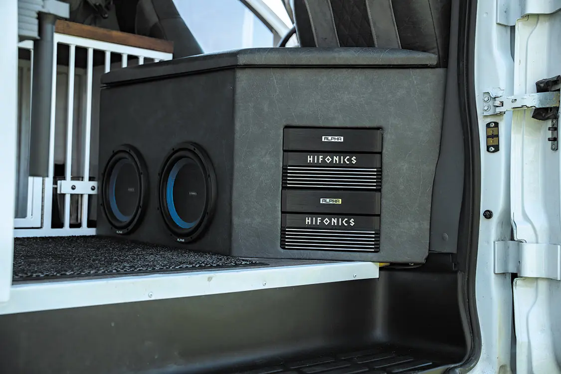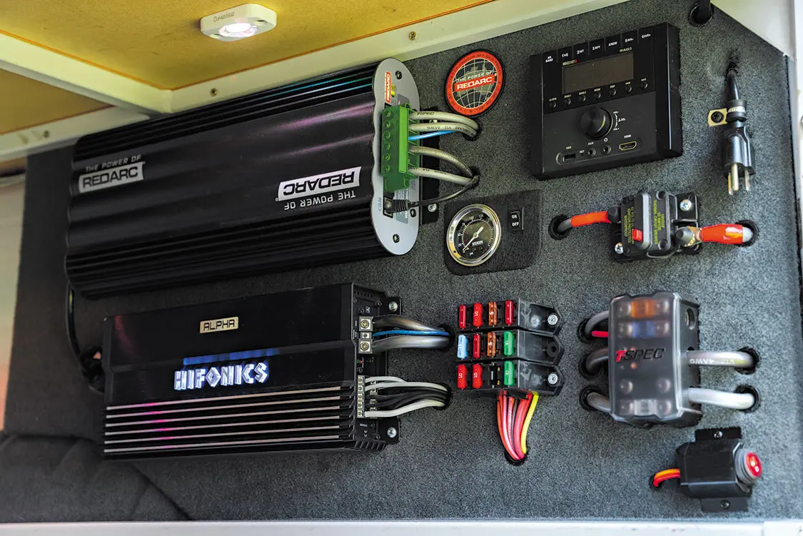 Rounding out the interior of the rig, there’s no shortage of tech anywhere. It’s business in the front, party in the back, with a Redarc Manager 30, MB Quart nav, and Midland radios on the dash and custom rear sliders holding a Snomaster fridge that keeps all of Lieberman’s drinks cold in the rear. Plus, wakeboard speakers mounted outside and Hifonics amps and subwoofers inside make the van a serious sound machine when the time comes for a party.