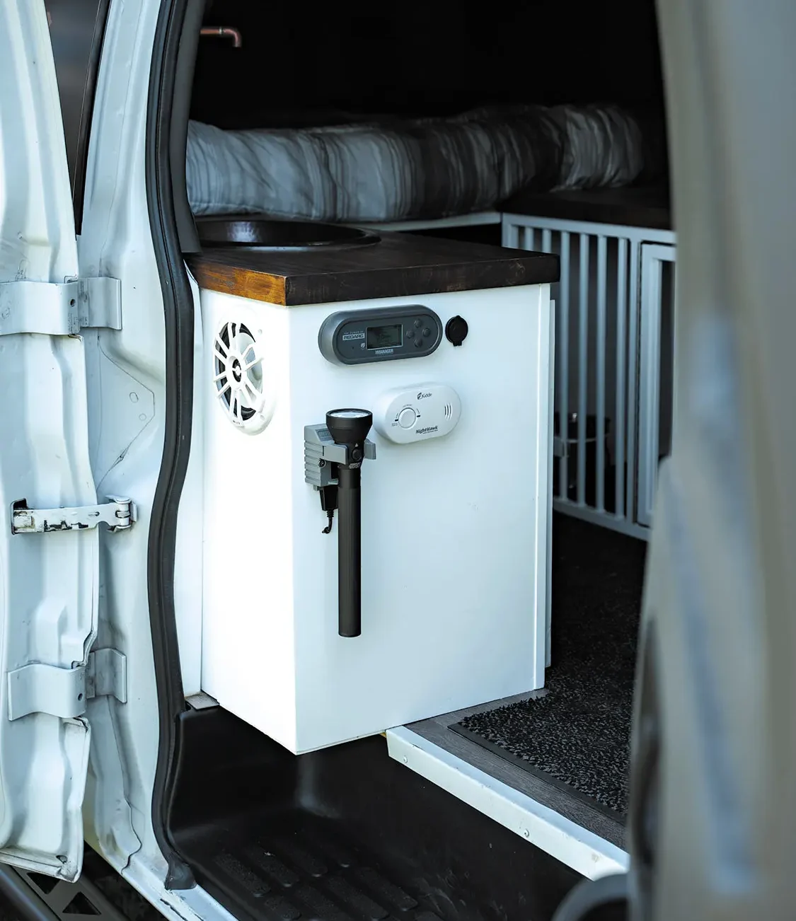 While he did build the van with practicality in mind, Lieberman wasn’t going to give up on comfort, either. His seats and steering wheel don custom suede and leather covers, while a queen-size bed platform takes up space in the rear of the cabin. A set of custom drawers hold gear and his bite suit securely during travel. It’s one good-looking interior, too, with butcherblock countertops and a copper sink.