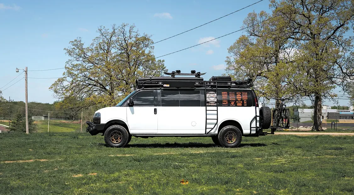 “All of the van’s modifications and many of its accessories, including rock sliders, swing out spare tire holder, roof rack, and ladder, were done by Lieberman himself though Rynobuilt.”