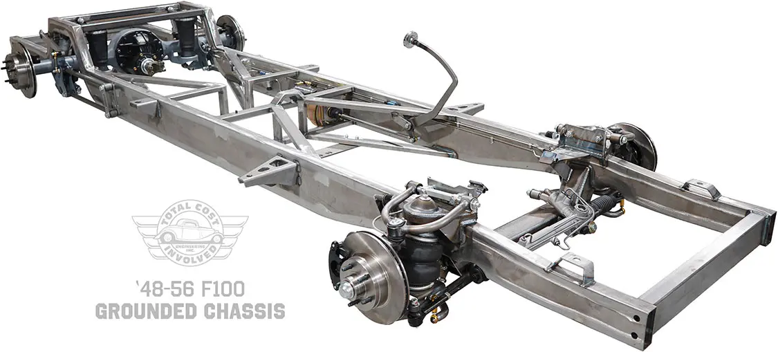 TCI Engineering offers its 1948-1956 Ford Truck Grounded Chassis. The rear frame rails have been kicked up and the front crossmember has been raised to put the running boards 1 inch off ground with 26-inch (front) and 28-inch (rear) tires. The frame features main rails with an extended height from 6 inches to 8 inches for increased rigidity. The clearance between upper and lower crossmembers is maximized while still retaining the original frame profile. The center section is custom built for each chassis to match the customer specified engine and transmission. The price is $16,538 with an eight-week lead time.