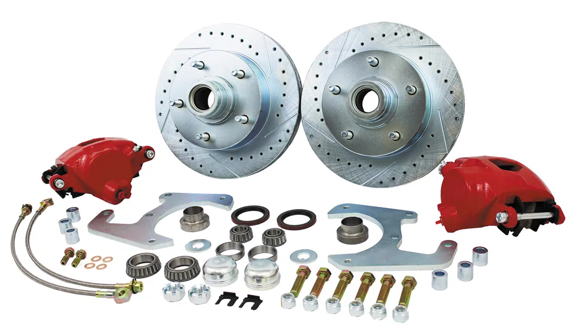 Performance Online recently released its ’48-’56 Ford F-1 and F-100 truck front disc brake conversion kit. It’s designed for the enthusiast who wants the added safety with a classic retro look. These disc brake kits are available in 5×4.5-, 5×4.75-, and the original 5×5.5-inch wheel bolt patterns and mount to the original straight axle spindle. Available upgrades include: drilled and slotted rotors, free zinc plating, stainless braided hoses, and red or black powdercoated calipers.