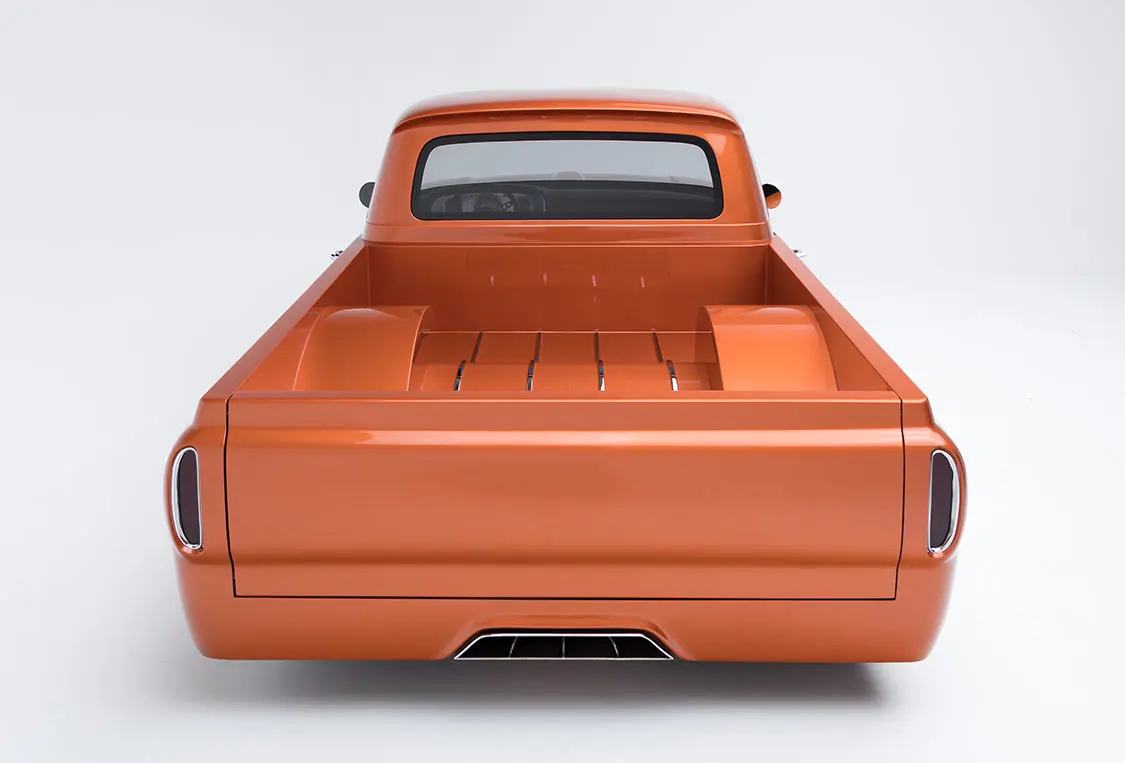 “The grille and bumpers are stock,” Mark says. “But we updated the wheelwells with custom tubs and crossovers, stretched the cab 3 inches, shortened the bed by 6 inches, and added shaved custom drip rails, a custom tailgate, bed strips, flush-mount glass front and rear, and welded body seams.”