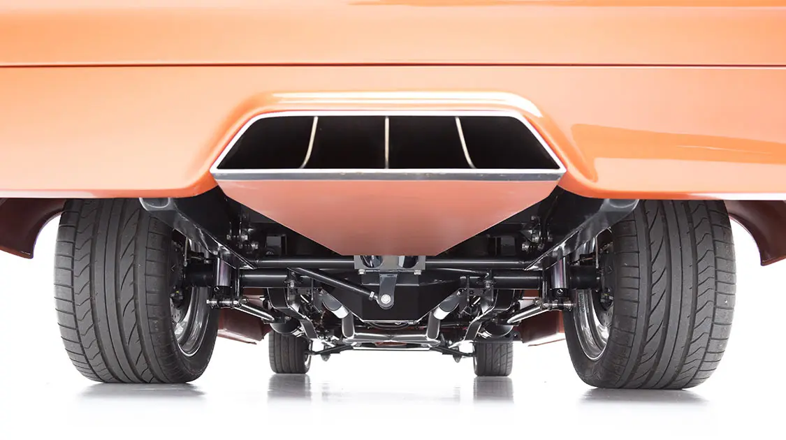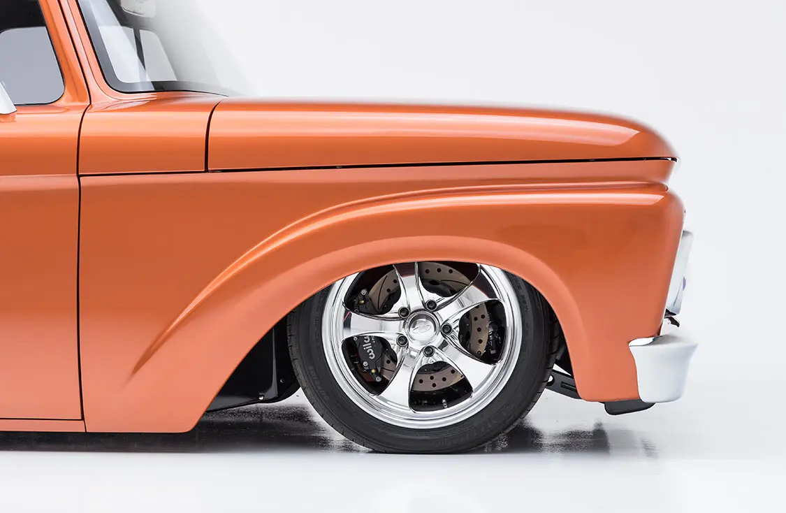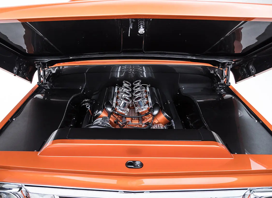 Mark started with the chassis. He worked with Porterbuilt Fabrication and Kenny’s Rod Shop on a customized 2017 frame, which includes a Porterbuilt front crossmember, fully boxed frame, and custom rear with built-in air tanks for Airlift air-ride front and back. It rides on Intro five-spoke wheels, 19 inches front and 20 inches rear, wrapped in Toyo Tires rubber. For stopping power, Wilwood Brakes, front and back, were chosen along with an electric e-brake.