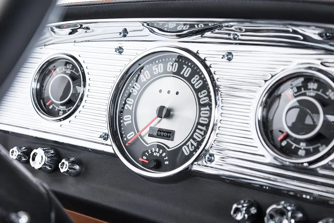 “Betsy has Classic Instruments gauges to match the factory look, a Billet Specialties steering wheel and a Kicker stereo,” Mark says. “She also has A/C custom control knobs, chrome strips that match ones in the bed, and fuses and wiring that are all hidden behind a custom panel in the back.”