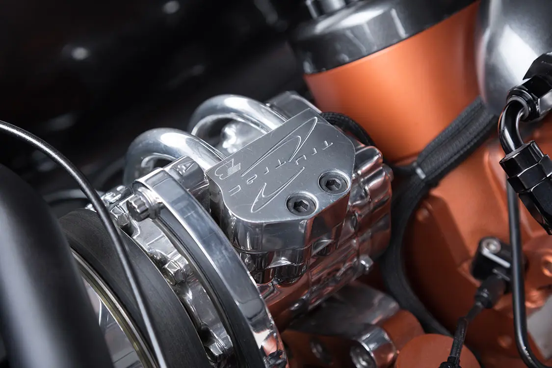 Created by RPM Transmissions out of Anderson, Indiana, Betsy’s transmission is a 2013 GM 4L60E. It features RPM Level IV upgrades to the output shaft and inner unit. The Hughes torque converter has a stall speed of 3,000 RPMs. Internal trans mods include an RPM-built 300M billet output shaft.