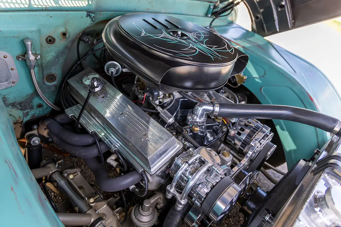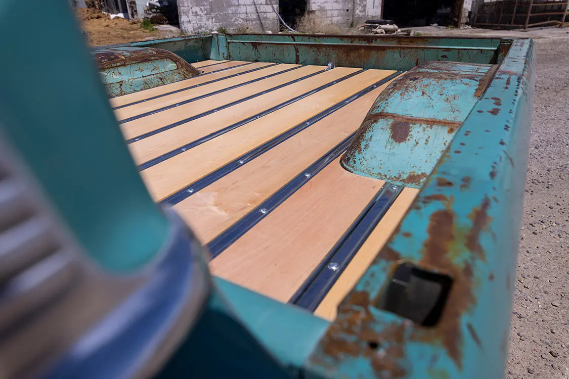 Speaking of the C10’s outer appearance, Sonny soon began working on modifying the factory rear wheel tubs, raising the bed floor, and creating a fresh wood plank, including a center panel that lifts for easy access to the suspension system below. Since this Chevy was designed to look like a “lowly” shop truck, Sonny felt compelled to embrace a patina-clad, weathered skin. Even though this is the style he was after, he still bodyworked the truck where he saw fit to repair severe rust damage. Next, he painted it very carefully to make it look like the turquoise paint had been left in total disrepair. This “faux-tina” method gives the truck the best of both worlds—a stylish, disheveled aesthetic combined with proper care and upkeep. To add the finishing touch to the truck’s outwardly charm, Jeff Devey of Jeff’s Graphics also of Twin Falls, was recruited to apply his sign painting and pinstriping talents in the form of Sonny’s shop logo to both doors.