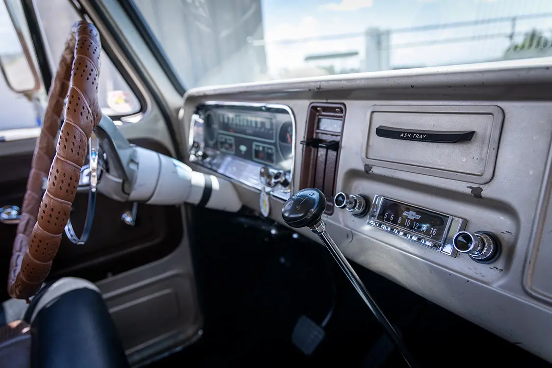 The interior of the C10 was refreshed to meet factory specs for the most part, which was right on point for this project. Quality Upholstery, another quality Twin Falls automotive business, joined the build by recovering the factory seat in fresh vinyl, as well as making new door panels for good measure. Aside from a Retro Manufacturing stereo that was added to give Sonny the convenience of shuffling through his tunes wirelessly, the cab space has been left as original as possible, and there’s nothing wrong with that.