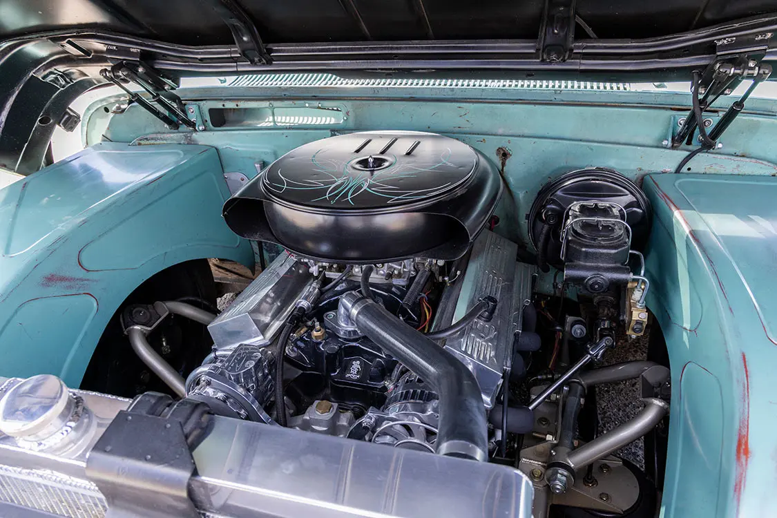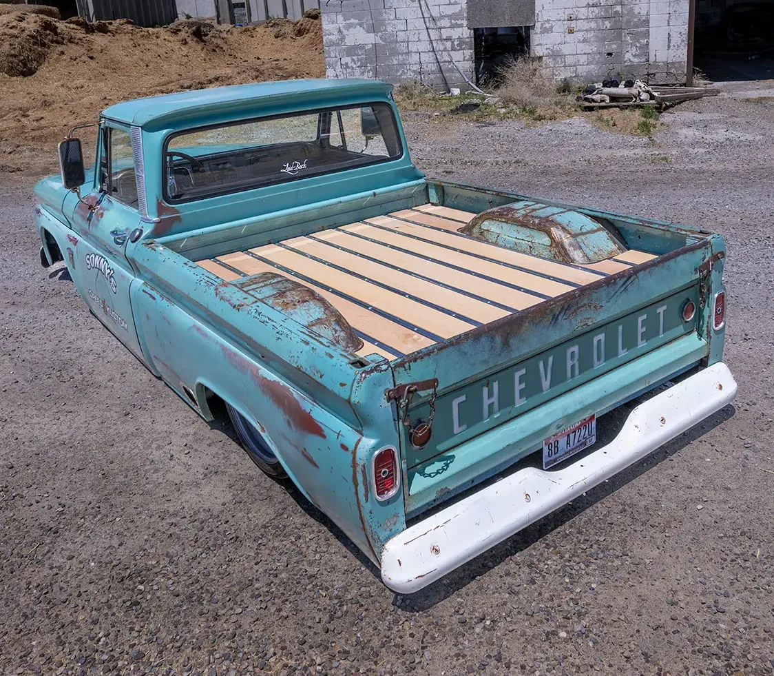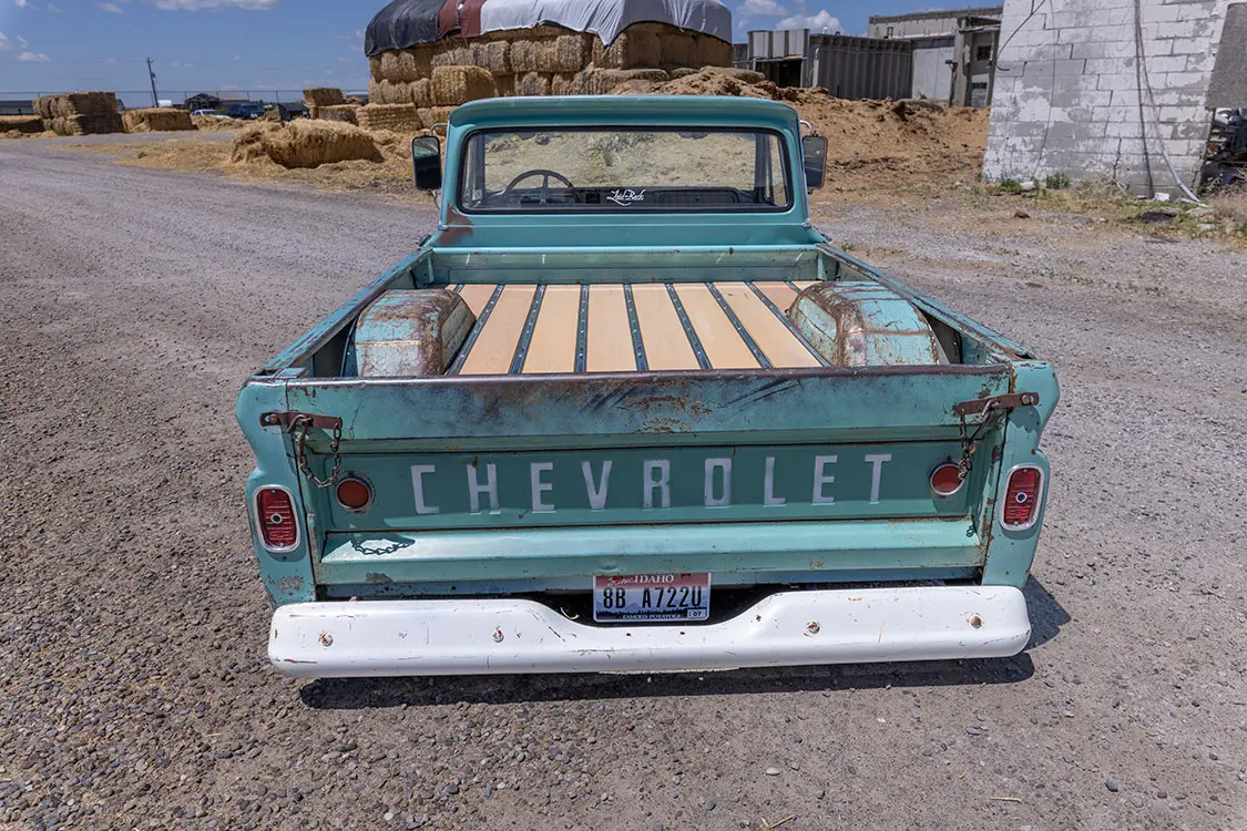 Speaking of the C10’s outer appearance, Sonny soon began working on modifying the factory rear wheel tubs, raising the bed floor, and creating a fresh wood plank, including a center panel that lifts for easy access to the suspension system below. Since this Chevy was designed to look like a “lowly” shop truck, Sonny felt compelled to embrace a patina-clad, weathered skin. Even though this is the style he was after, he still bodyworked the truck where he saw fit to repair severe rust damage. Next, he painted it very carefully to make it look like the turquoise paint had been left in total disrepair. This “faux-tina” method gives the truck the best of both worlds—a stylish, disheveled aesthetic combined with proper care and upkeep. To add the finishing touch to the truck’s outwardly charm, Jeff Devey of Jeff’s Graphics also of Twin Falls, was recruited to apply his sign painting and pinstriping talents in the form of Sonny’s shop logo to both doors.