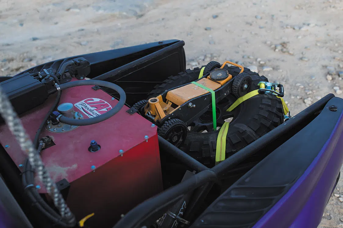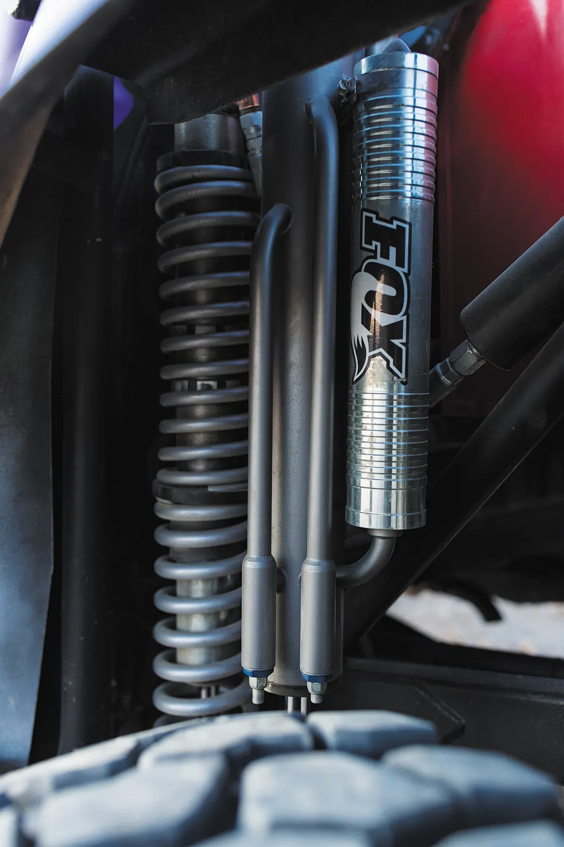 The truck features a Camburg +3.5 long-travel suspension kit paired with a TMR Customs rear trailing arm 4-link suspension system. Thanks to the custom cab-back tube chassis, these elongated trailing arms fit nicely mounted to the undercarriage of the truck while also adding clearance to the frame in consideration of the truck’s impressive 13 inches of up-travel.