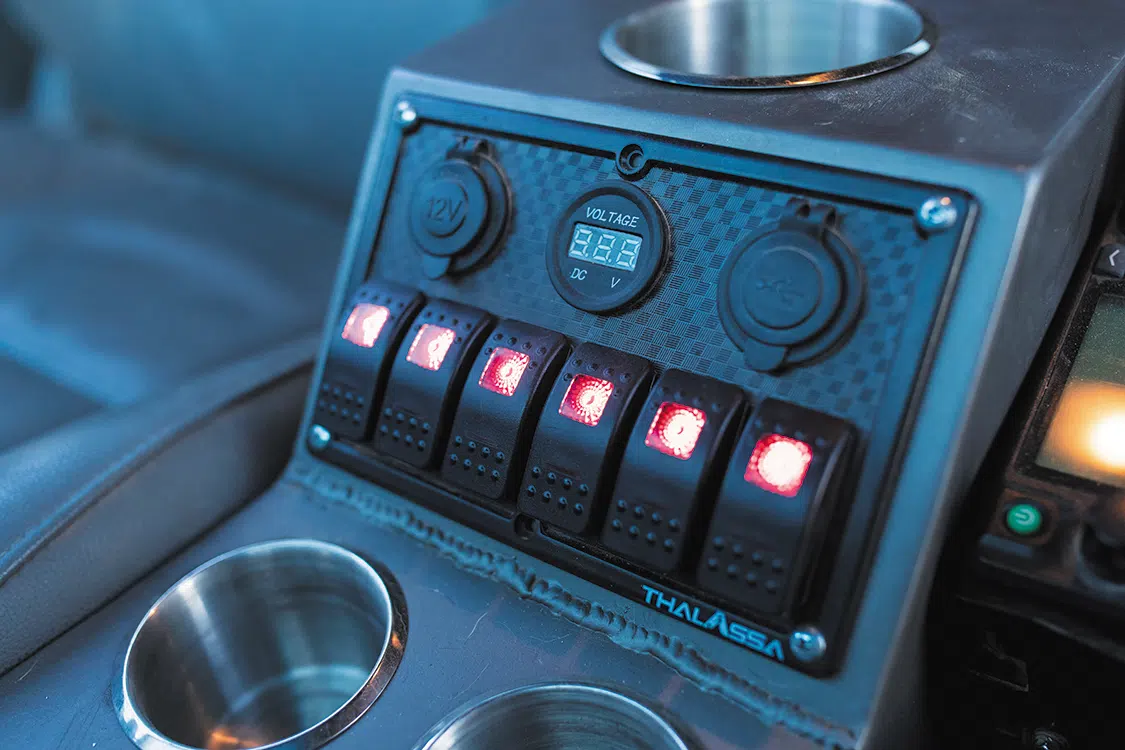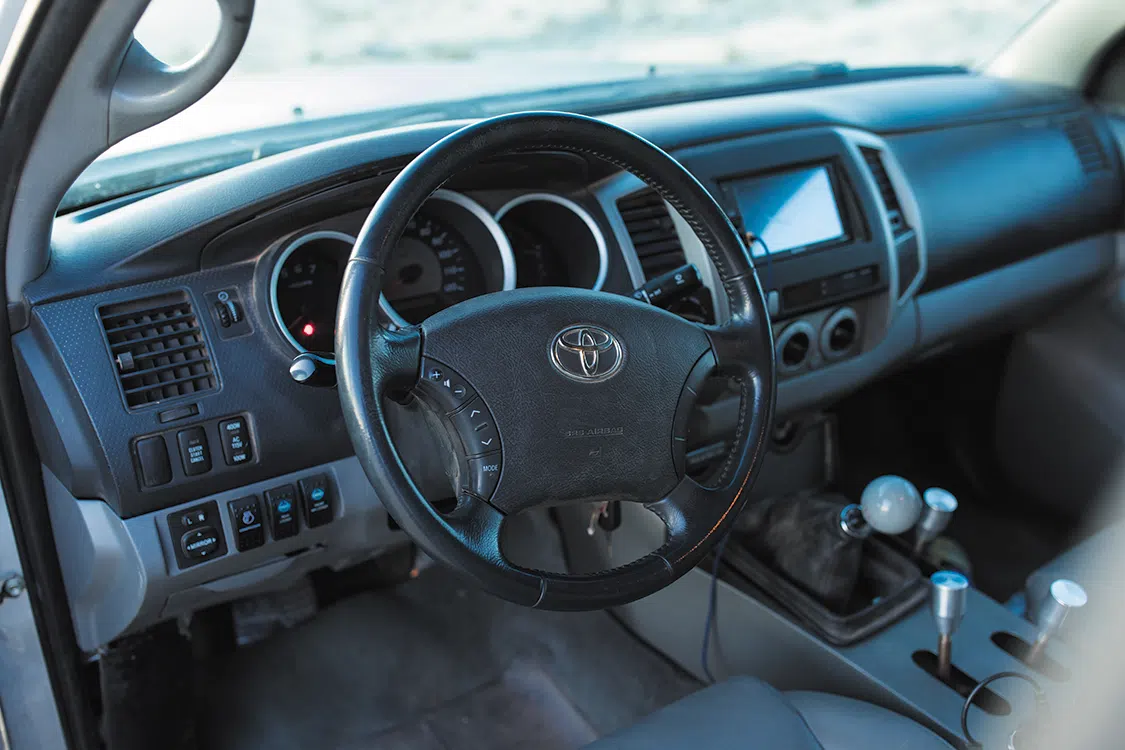 Inside, the truck remains mostly factory, keeping things simple but with the added comforts of a road-worthy vehicle. One custom addition to the inside of the truck is a custom center console built by David, Kyle, and friend Chris Goss. This center console features dual shift levers for the secondary gearbox, as well as a TRD short shifter for the truck’s manual transmission.