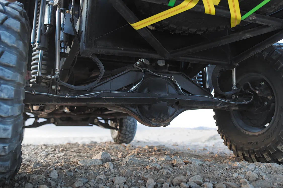 The truck features a Camburg +3.5 long-travel suspension kit paired with a TMR Customs rear trailing arm 4-link suspension system. Thanks to the custom cab-back tube chassis, these elongated trailing arms fit nicely mounted to the undercarriage of the truck while also adding clearance to the frame in consideration of the truck’s impressive 13 inches of up-travel.