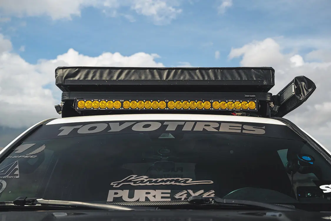 Adorned with a 40-inch Baja Designs light bar, a Front Runner roof rack also holds an RTT and more Front Runner gear including an awning.