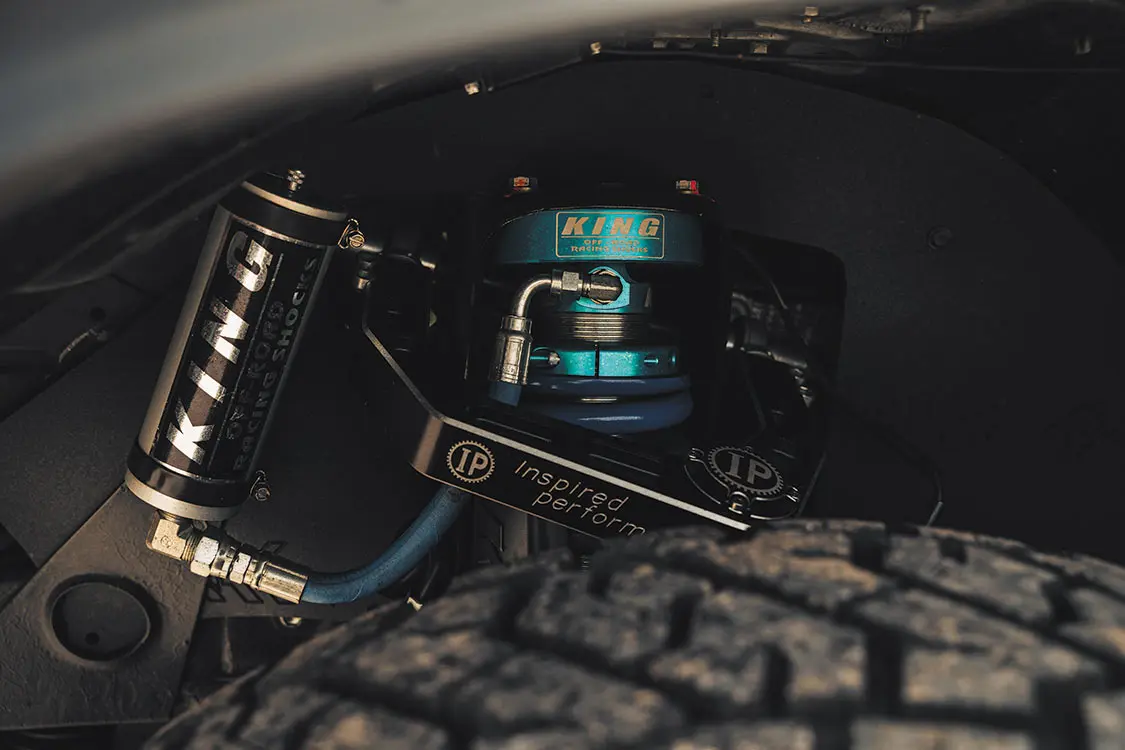 Suspension: Front: KING Coilovers 2.5, KING Shock Guards,  Inspired Overland Upper Control Arms, DRKDSS Sway Bar End Adapters, DRKDSS Sway Bar Billet Clamps, DUROBUMPS Bump Stop. Rear: KING Shocks 2.5, Icon Overland HD Springs, Icon Track Bar, Inspired Overland Rear Trailing Arms, DRKDSS Drop Spacers, DRKDSS Bolt On Track Bar Correction Kit, DUROBUMPS, Bump Stop, Rago Fabrications Shock Guard