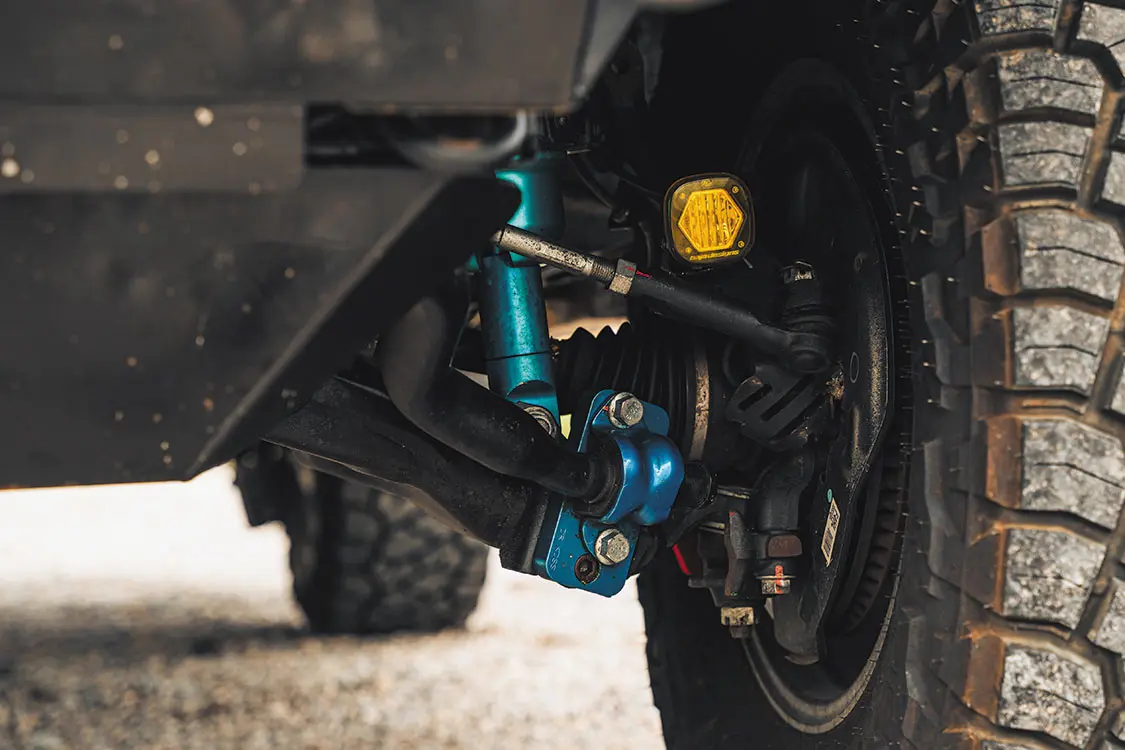 In the front alongside the King coils are King Shock Guards and DUROBUMPS bumpstops. Inspired Overland Upper Control Arms and DRKDSS Sway Bar End Adapters and Sway Bar Billet Clamps keep everything steady and help to achieve that trademark smooth King ride.