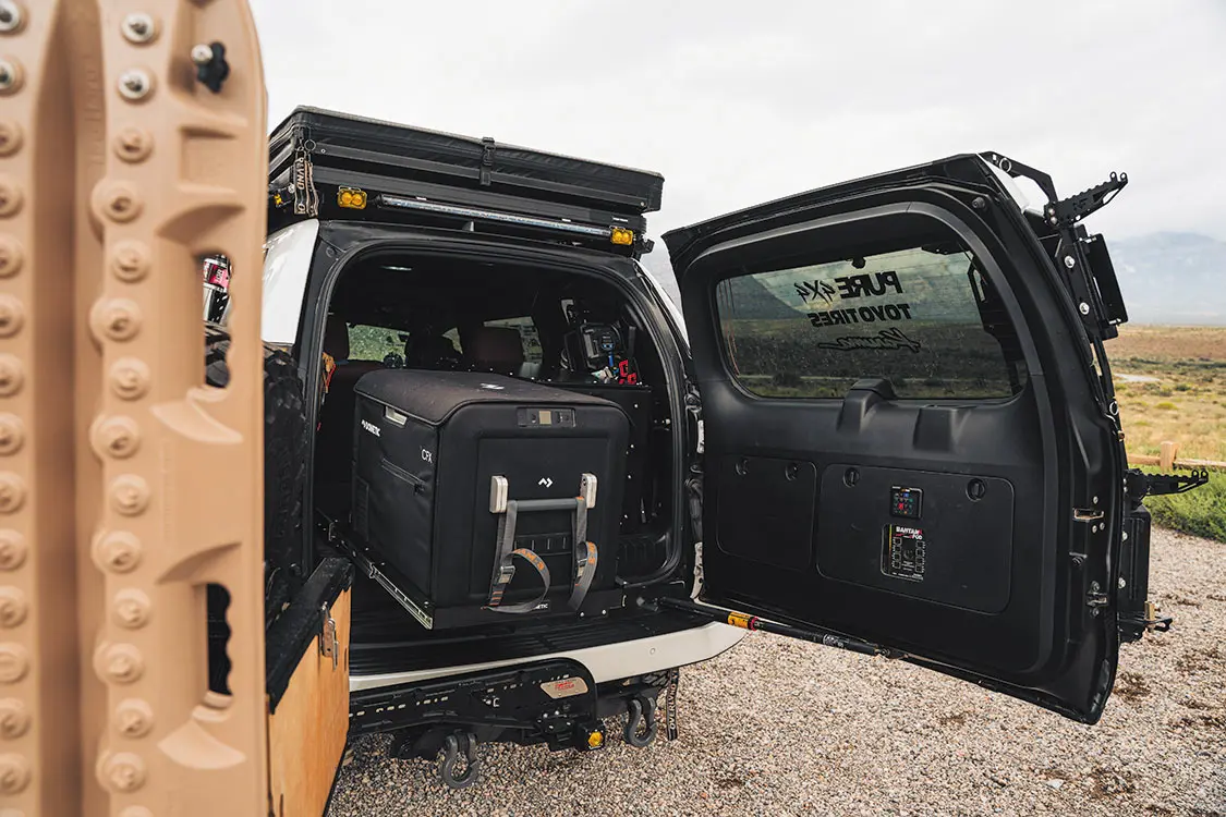 Interior Accessories: DMOS Pro Shovel; H3R Performance fire extinguisher; Well Visors window visors; F-Sport Interior seats, red; Pelican Ruck Cases, Aiden James Customs Dual Drawer, Aiden James Customs Gear Plate; sPOD BantamX Custom Light Management; Dometic CFX3 55L fridge, Slider; Ohana Rig Supply Captain Panel; Midland Radio MXT-574; Optima Battery