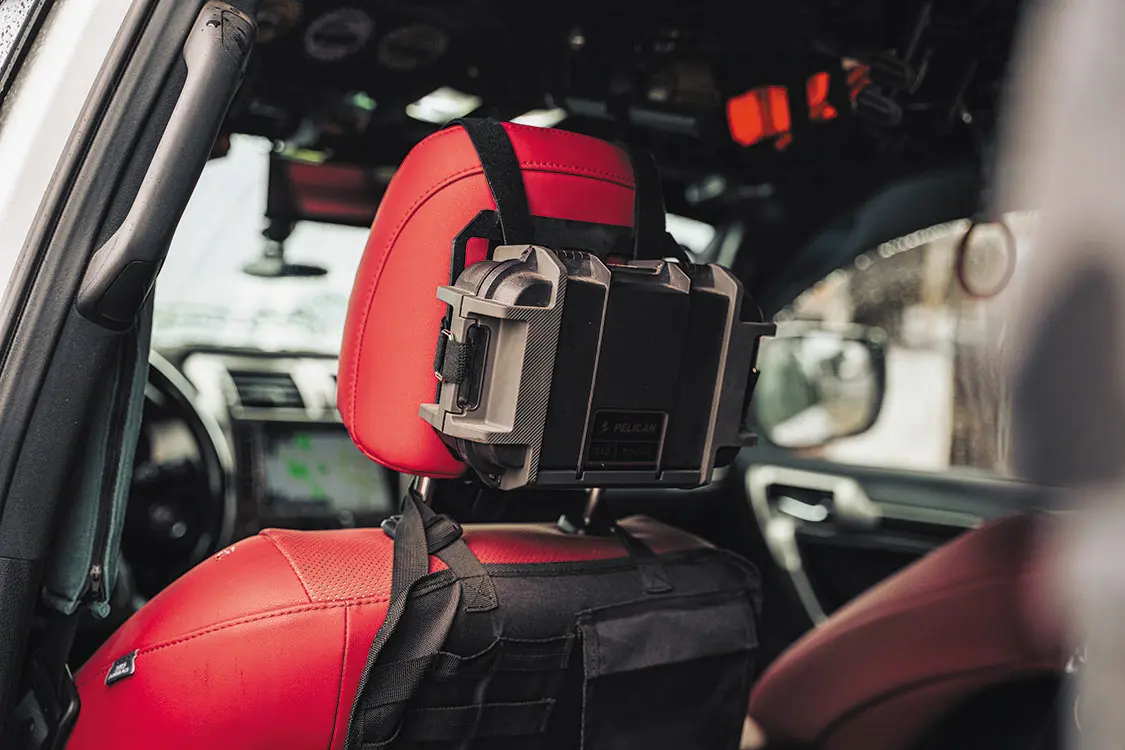 He uses Pelican Vault Cases and BX Series Cases mounted on JW-Offroad side molle panels and the roof to keep all of his gear safe, dry, and organized. The decals you see all over the rig are provided by Grafix Lab decals.