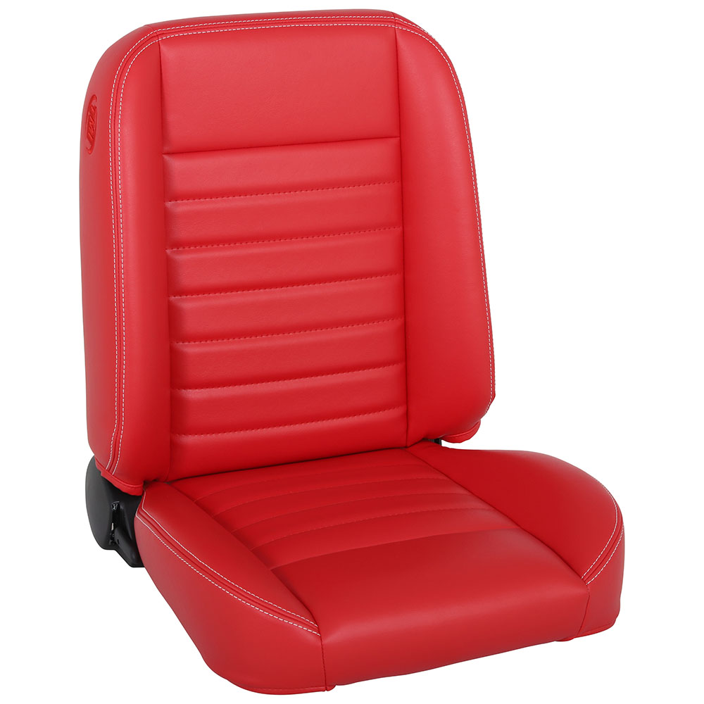 All Cruiser Collection seats feature a classic upholstery pattern and completed seats are fully assembled and can be reclined to get just the right angle for maximum comfort. Vehicle specific mounting brackets, which are sold separately, allow Cruiser collection seats to bolt right into your ride. Universal Brackets are also available for vehicles with modified floor pans as well as other vehicles that are outside of the TMI vehicle offering. To make ordering easy, the Cruiser Collection launched with a more limited color palette of black (available with red, white, blue, or black contrast stitching) or saddle brown (available with white or brown contrast stitching) vinyl.
