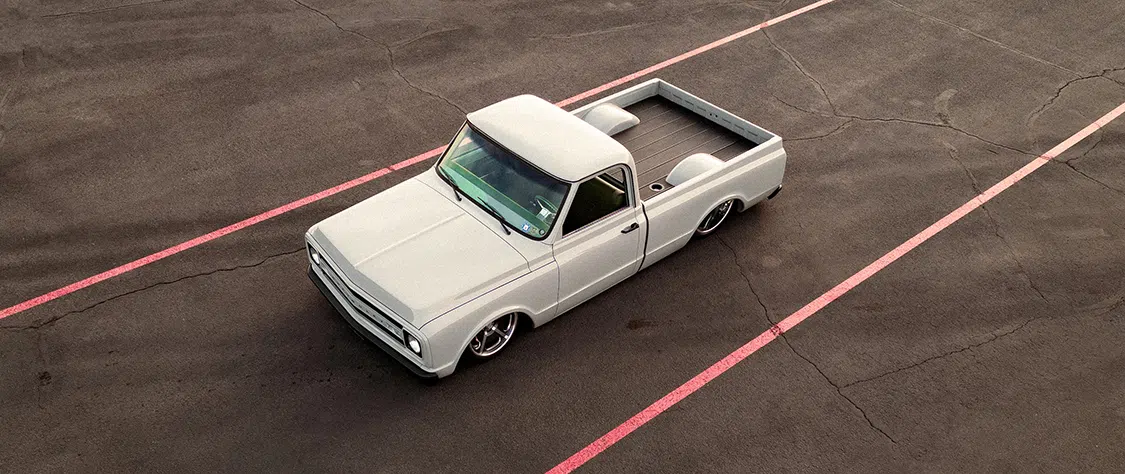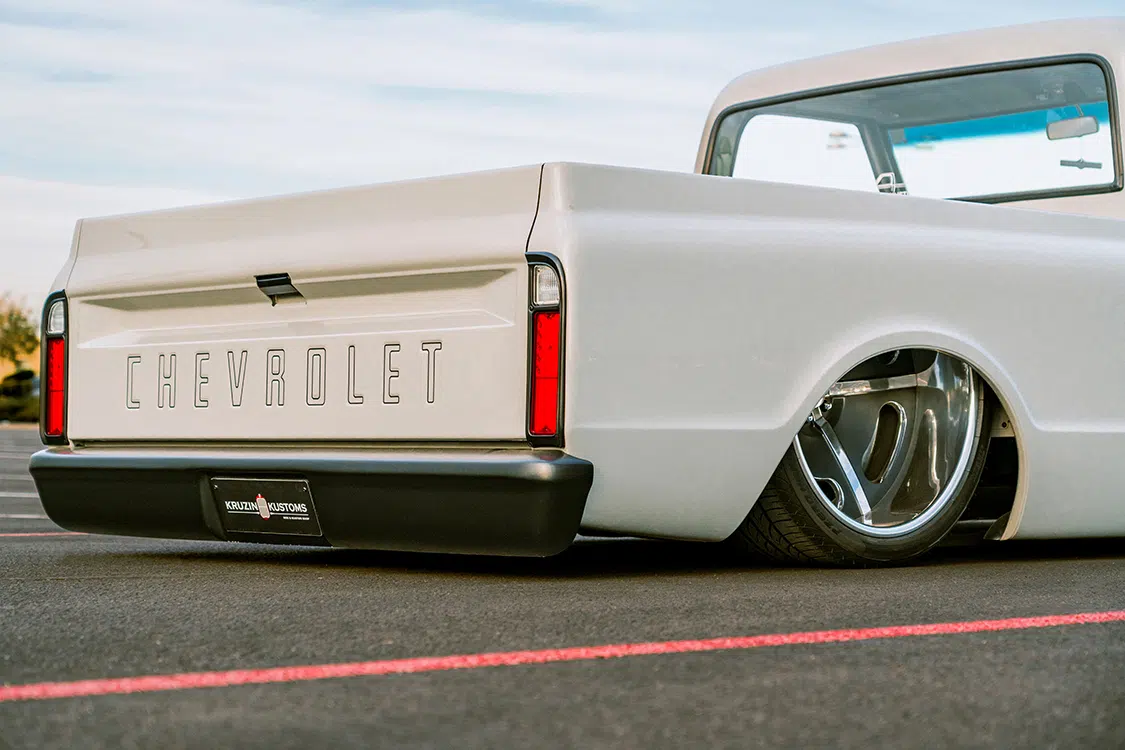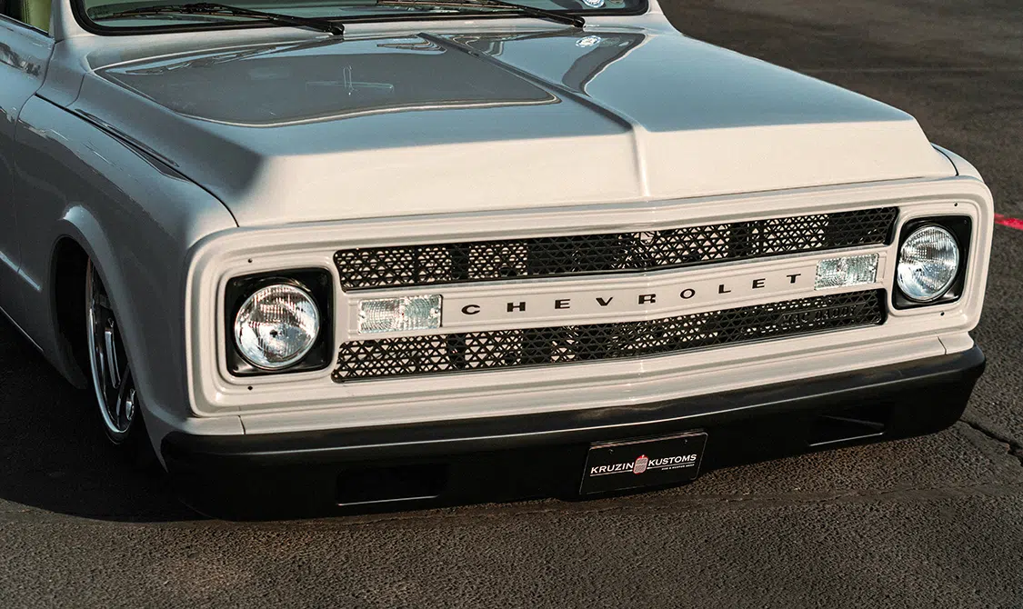 The first thing that grabs your attention is the truck’s exterior. Todd opted for a new front grille from a 1969 Chevy C10 that he snagged from LMC Truck. The original factory bumpers got a little love too as they were narrowed for a tighter fit. The bodywork didn’t stop there—shaved indicator lights, a shaved scuttle panel, and smoothed-out doors without trim give this C10 a slick, clean look. Topped off with a chalk-white paintjob by Justin at Kruizin Kustoms, the truck looks sharp and mean on the street.