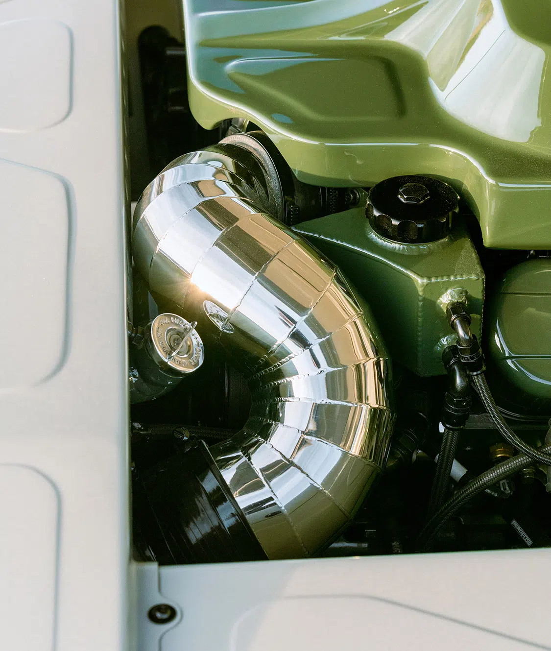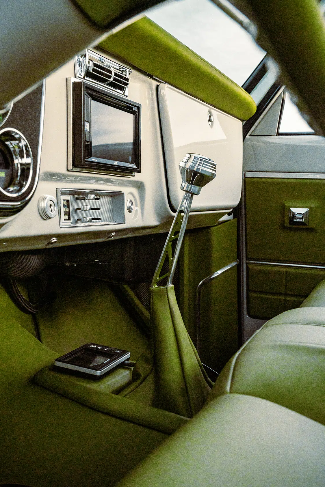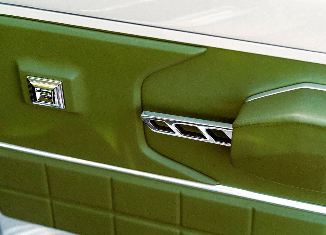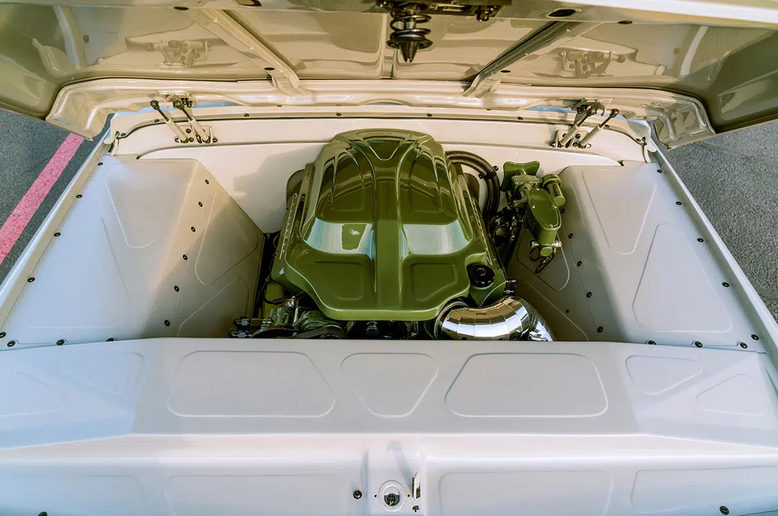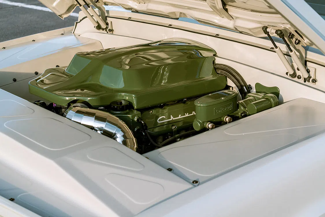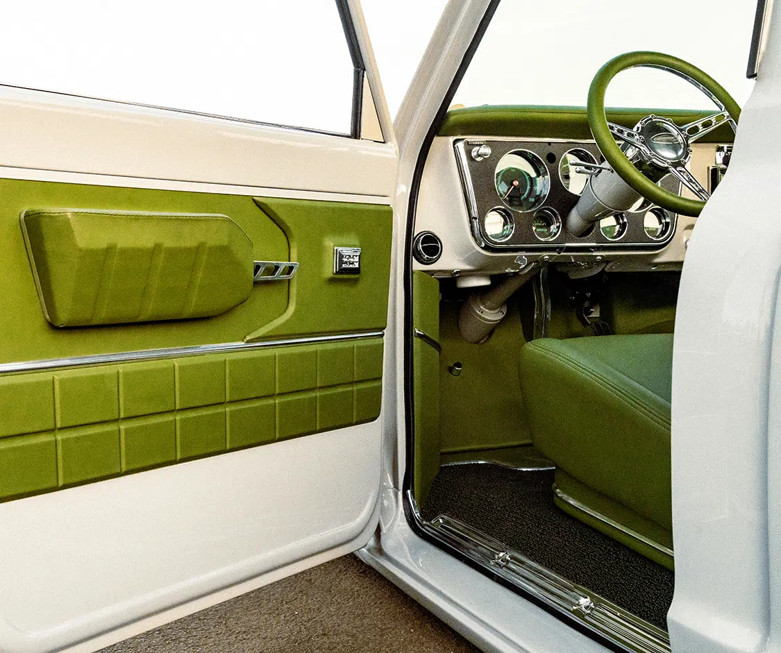 Under the hood, this klean kruzier roars with a 6.2L Chevy V-8 engine from a 2020 model GM. Kruizin Kustoms handled the engine build and installation, adding “Block Hugger” headers from Ultimate Headers and a custom stainless 3-inch exhaust system. The front-drive pulley system from Billet Specialties and a custom-made cold air intake box round out the engine upgrades.