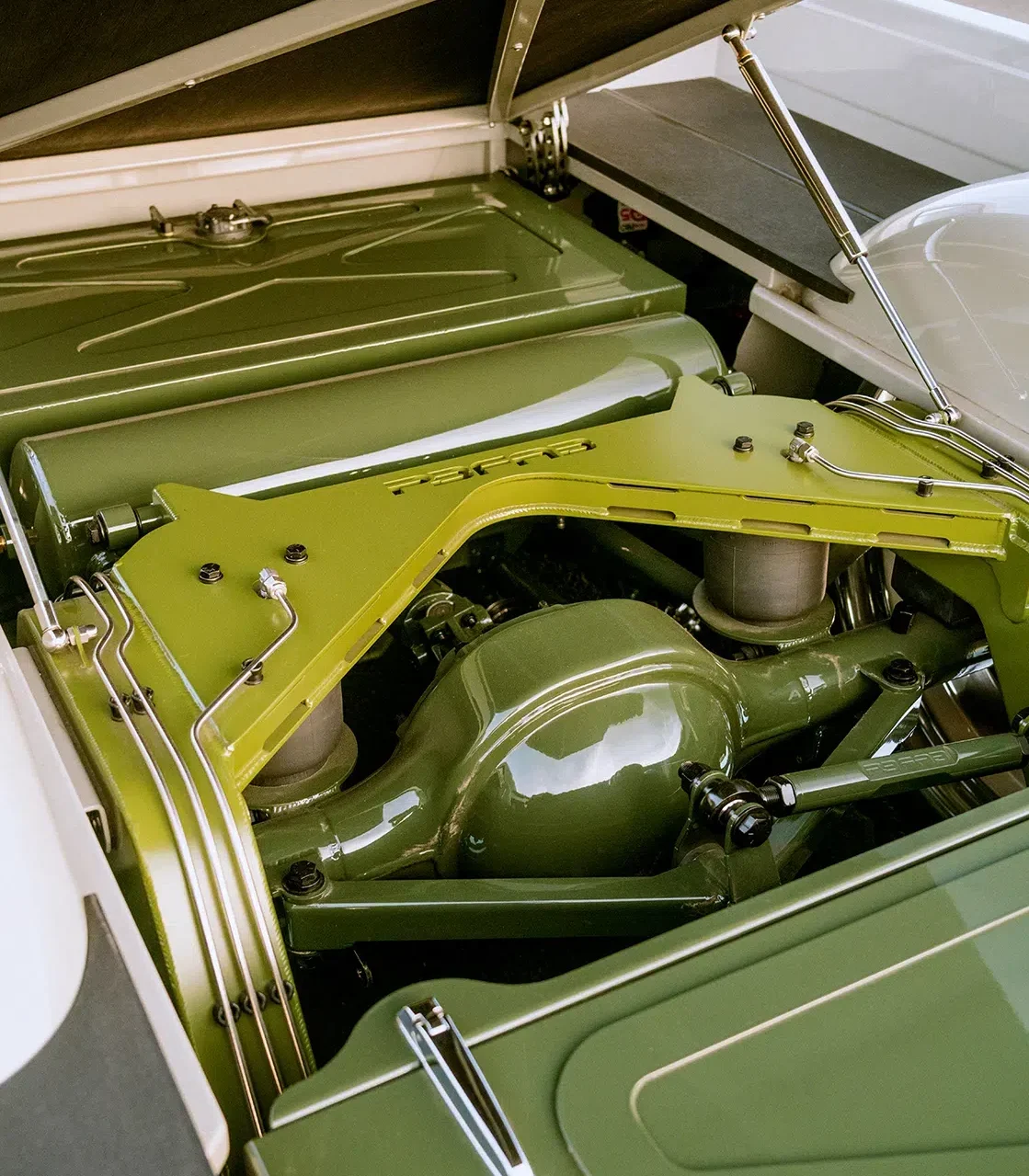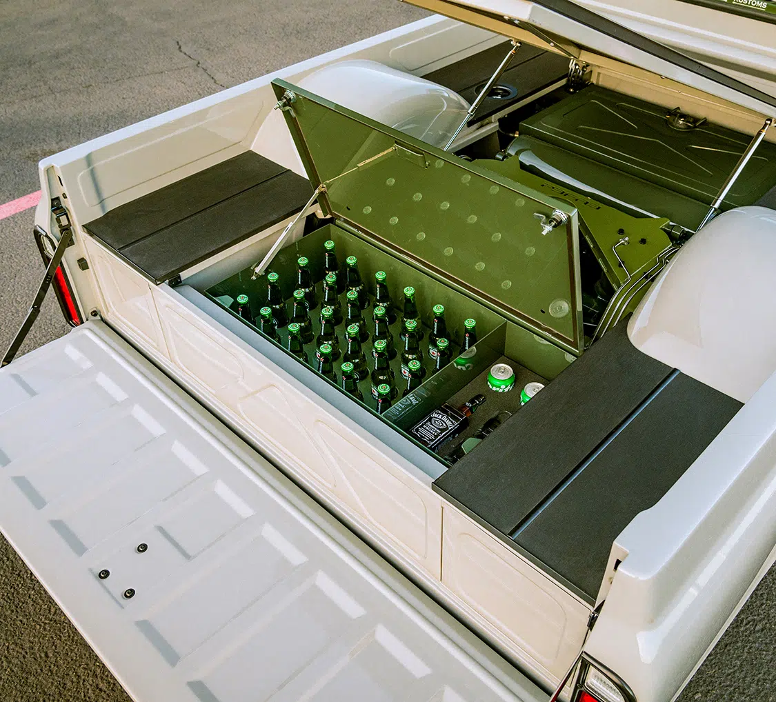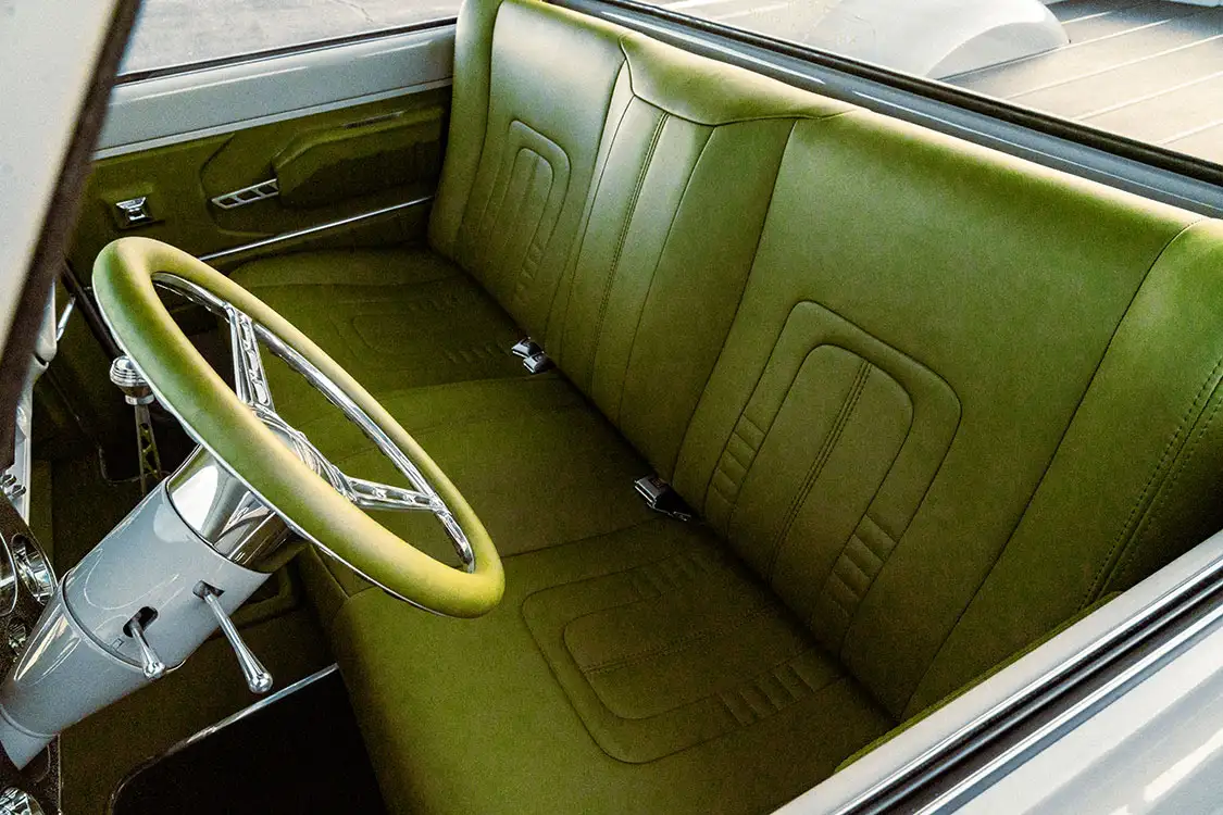 The chassis has been worked over by adding a Porterbuilt rear clip frame upgrade with a Heidts independent front suspension system. The front suspension includes RideTech Shockwave airbags, while the rear rides on Firestone airbags, with all four shocks from RideTech. A Flaming River power steering rack keeps handling tight. Kruizin Kustoms also crafted a custom alloy fuel tank, painted the frame green, mounted a beer cooler in the bed, and installed a scissor hinge bed lift.