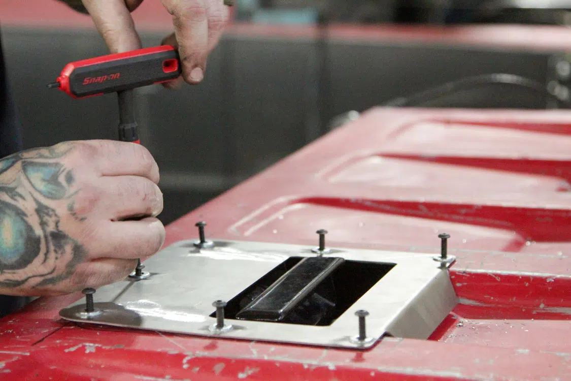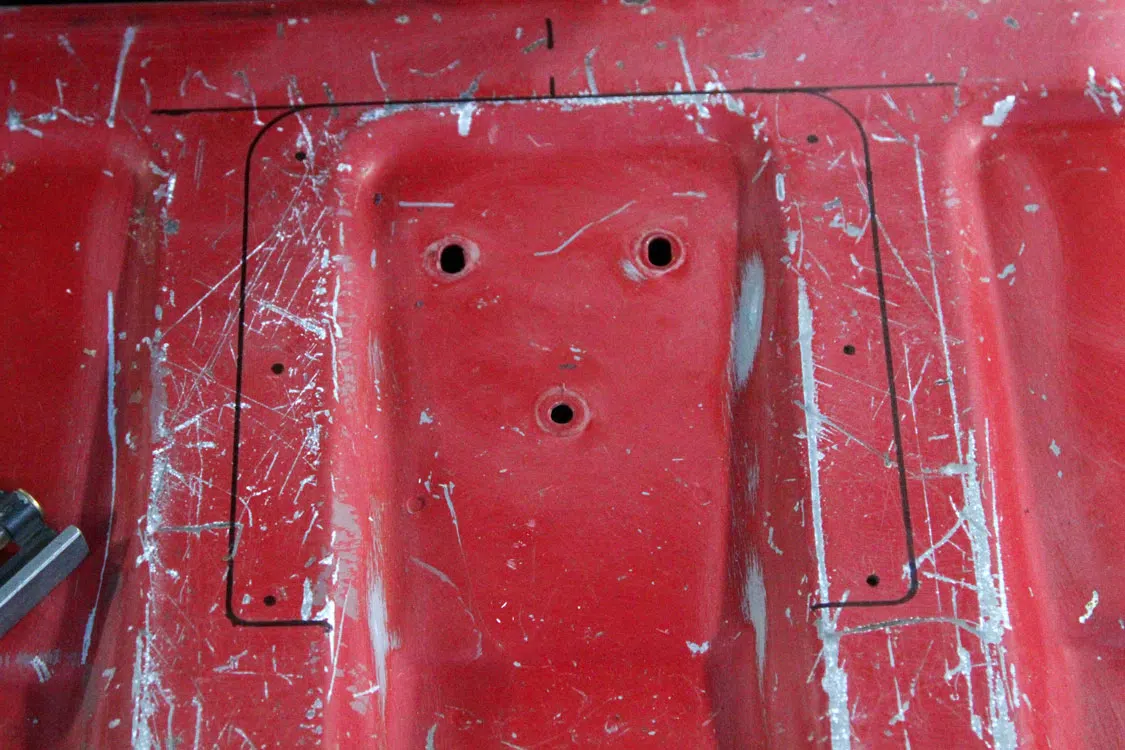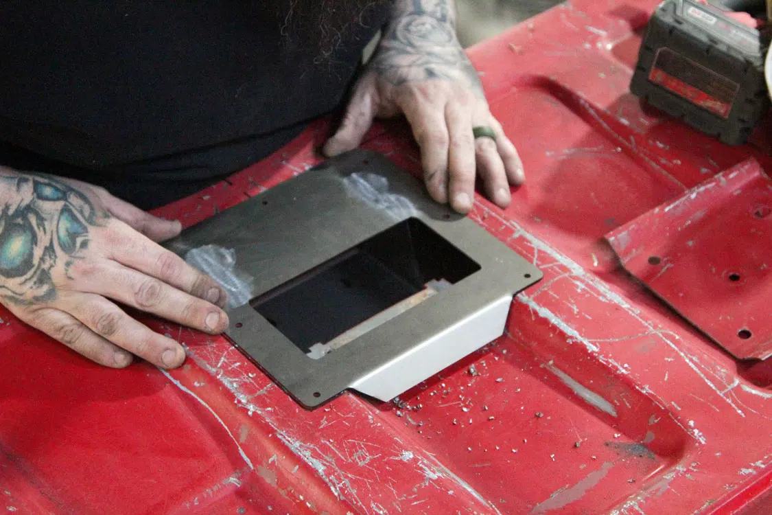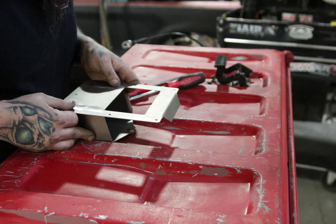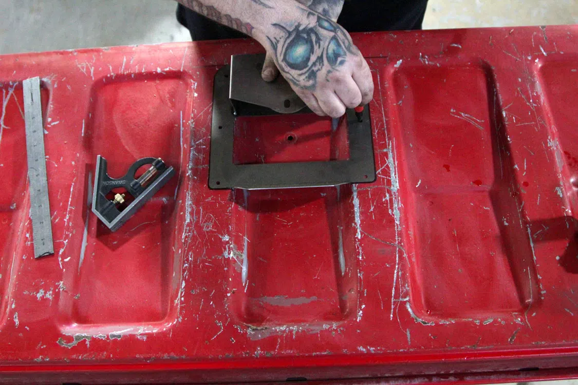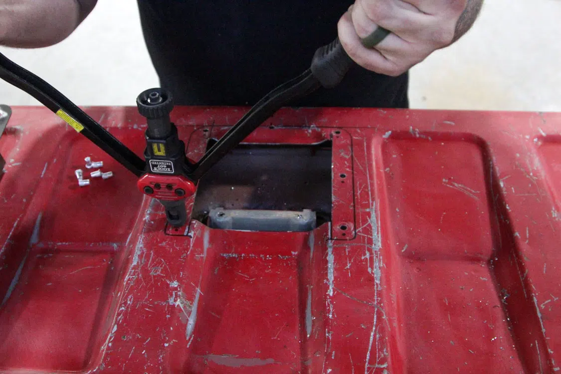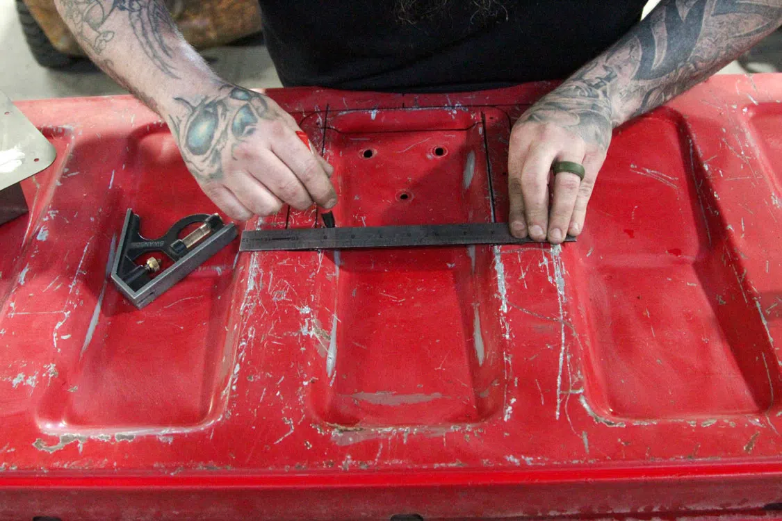 A cut-off wheel works great for cutting out the sheetmetal not needed where the bracket goes.With the material removed from the inside of the tailgate, you can see exactly where the bracket will go.Test fit the relocation bracket to the tailgate. Double check that the holes still line up.Center punch the hole marks in preparation of drilling.Drill the holes to bolt in the relocation bracket.We use a nutsert tool to install threaded bungs into the tailgate to make easy removeal if needed down the road.Nutserts are installed, and now we’re ready to bolt in the relocation bracket.Bolt in the original handle to the relocation bracket.Bolt in the relocation bracket.Test fit again into the tailgate.Remove the plastic “keeper” clips on the opposite sides of where they were originally installed. Now is a good time to replace these if they appear brittle.Here’s a visual of the handle installed through the old existing handle hole. It’s a good time to make sure that it’s working properly, pulling both latch rods.Begin removing the paint, primer, and sealer down to bare metal.Make sure all existing material is removed. A clean, bare metal surface will yield the best weld/results.Test fit the supplied filler.We noticed that the filler came flat and needed a roll to match the tailgate contour. We used a 36-inch slip roller to match the roll.A lot better fit after the roll.We cleaned the edges of the filler to also make sure of a clean welding surface.Weld-though primer is used on the back side of the panel.A long magnet is used to hold the filler in place before tacking in securely.We place a few tacks around the perimeter to hold the panel in place. Note: They are spaced apart far enough to prevent too much heat and warping.A few more tacks between the previous tacks. Once again, take it slowly to prevent too much heat.After a half to whole day, the filler is fully welded into place. The fabricator finds other tasks throughout this day to keep busy while the panel cools after so many tack welds.The grinding process begins. This will also create heat that can warp. Not a lot of pressure is needed in conjunction with keeping the grinding wheel as flat as possible to prevent digging into the material. A flap disc is being used here.Compressed air can be applied between the tacks and grinding to help cool the overall panel to prevent warpage.A 3-inch sanding disc is used to further knock down any high spots and to feather the material.A DA sander is then used to further feather the existing material and remove grinding marks.With the filler panel welded and ground smooth, it is time for some filler and paint.The tailgate was reinstalled and tested before it was taken back apart and sent off to the paint and body shop.