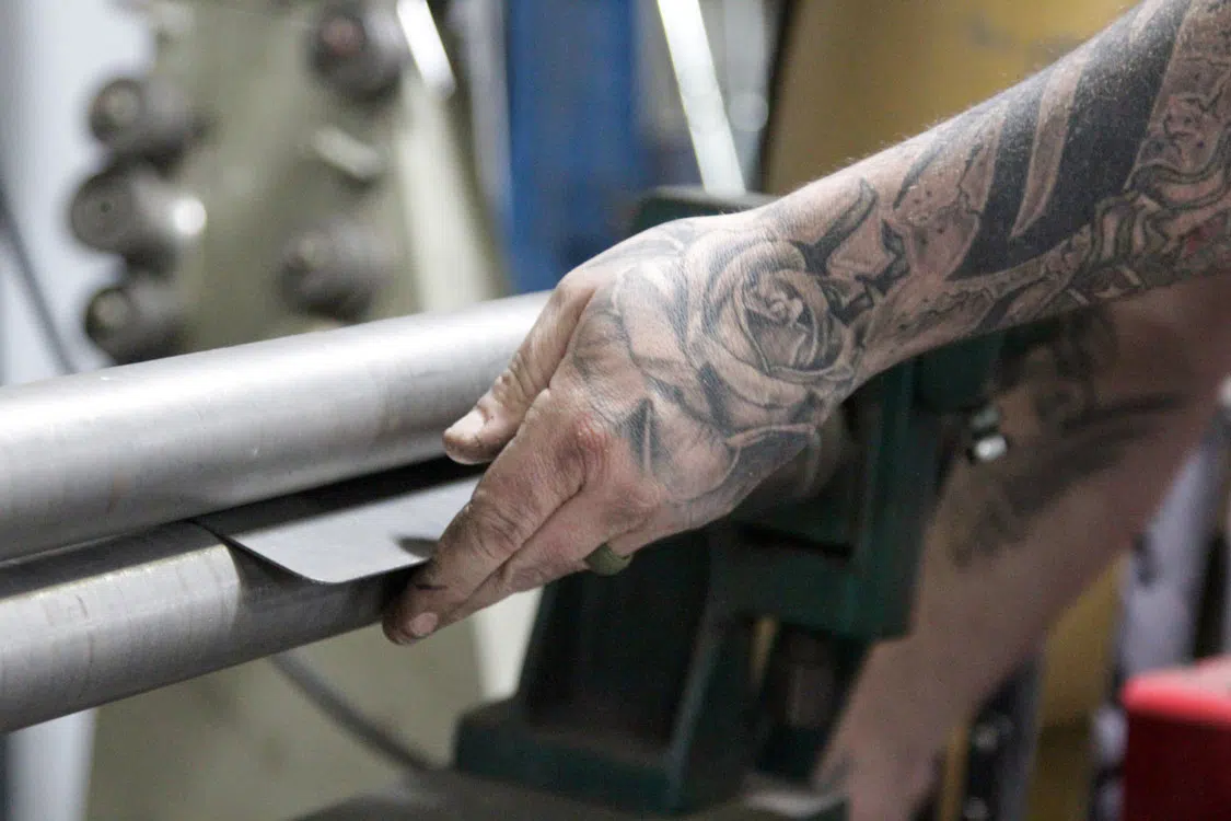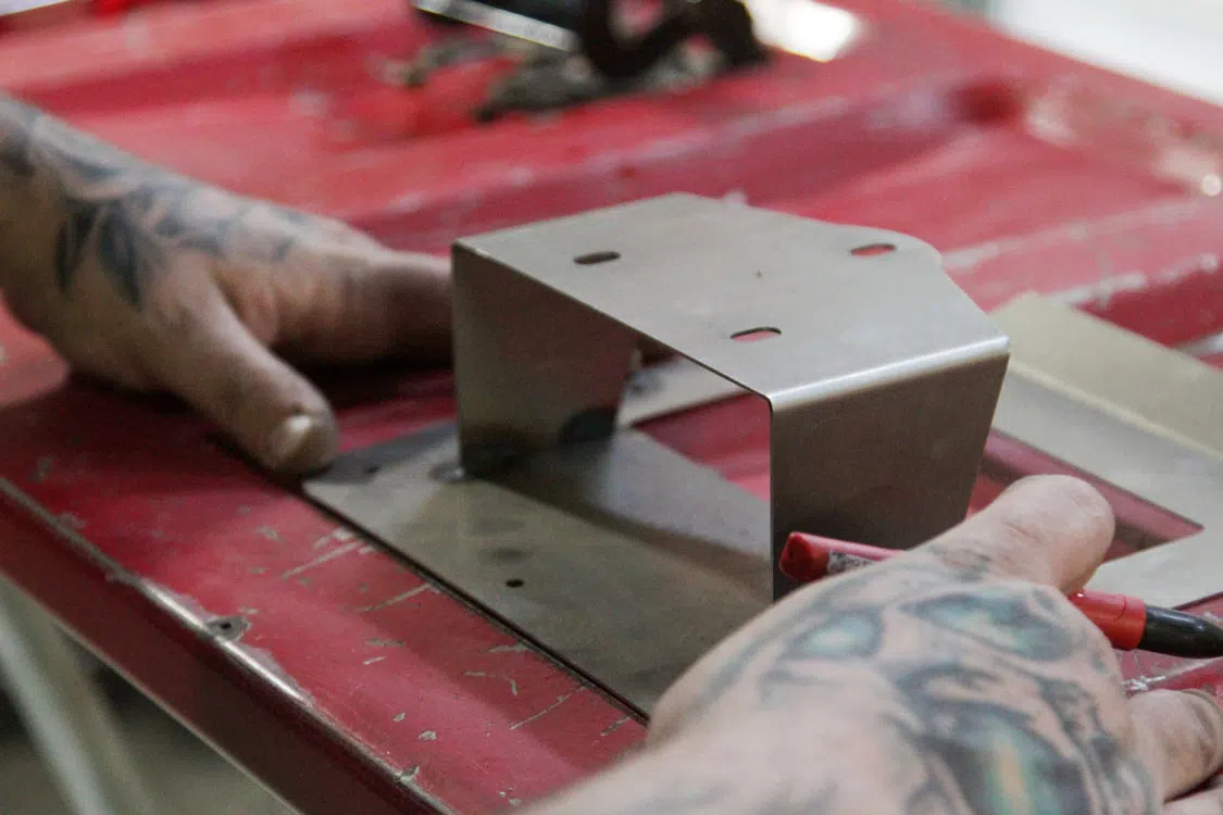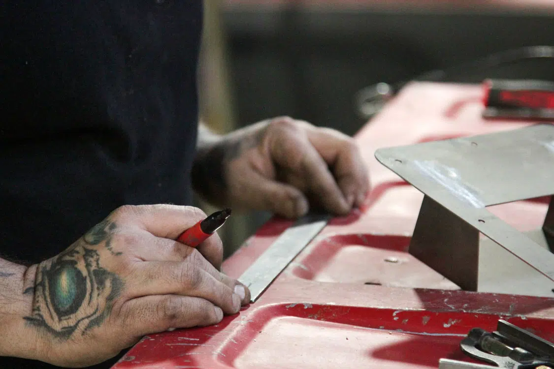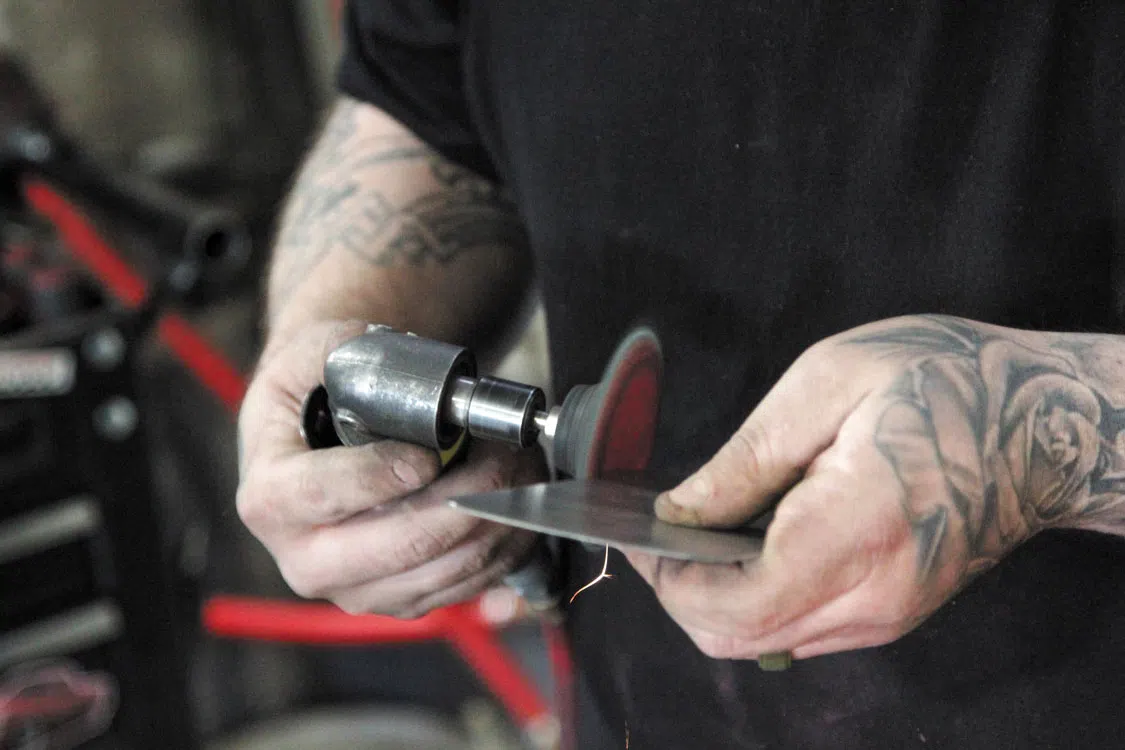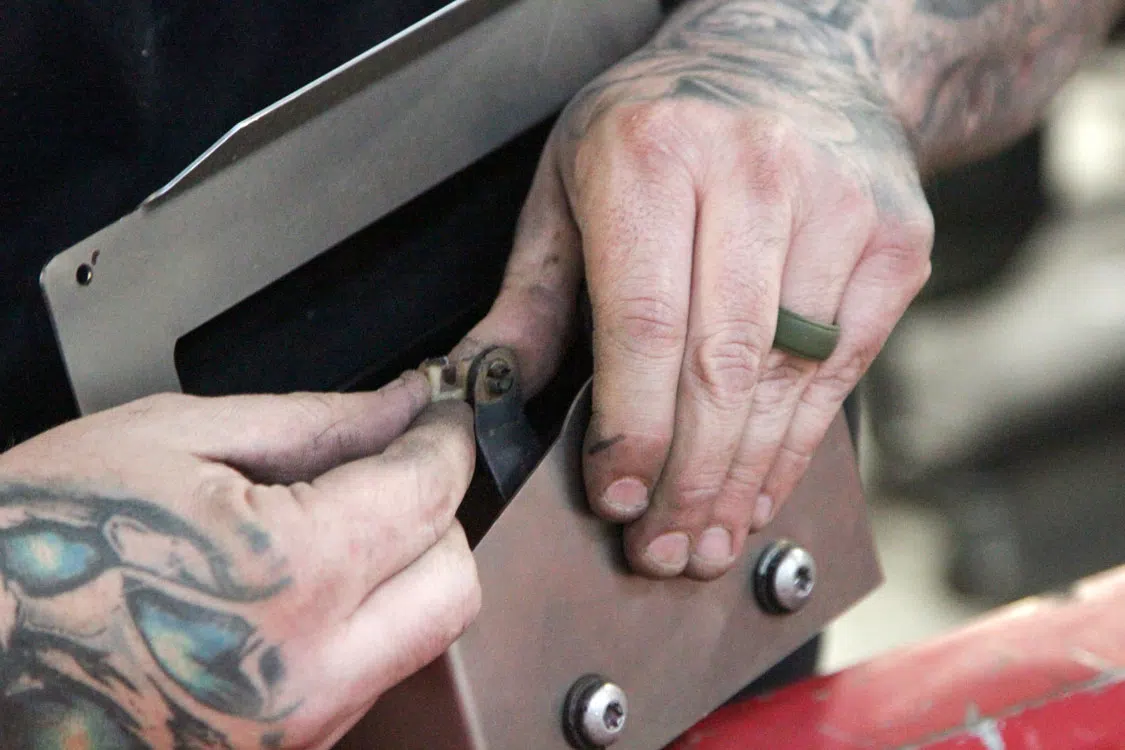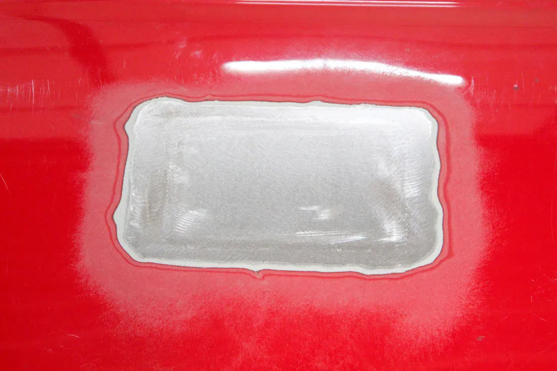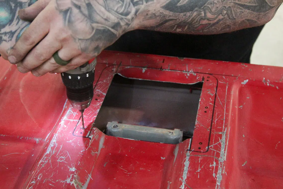 A cut-off wheel works great for cutting out the sheetmetal not needed where the bracket goes.With the material removed from the inside of the tailgate, you can see exactly where the bracket will go.Test fit the relocation bracket to the tailgate. Double check that the holes still line up.Center punch the hole marks in preparation of drilling.Drill the holes to bolt in the relocation bracket.We use a nutsert tool to install threaded bungs into the tailgate to make easy removeal if needed down the road.Nutserts are installed, and now we’re ready to bolt in the relocation bracket.Bolt in the original handle to the relocation bracket.Bolt in the relocation bracket.Test fit again into the tailgate.Remove the plastic “keeper” clips on the opposite sides of where they were originally installed. Now is a good time to replace these if they appear brittle.Here’s a visual of the handle installed through the old existing handle hole. It’s a good time to make sure that it’s working properly, pulling both latch rods.Begin removing the paint, primer, and sealer down to bare metal.Make sure all existing material is removed. A clean, bare metal surface will yield the best weld/results.Test fit the supplied filler.We noticed that the filler came flat and needed a roll to match the tailgate contour. We used a 36-inch slip roller to match the roll.A lot better fit after the roll.We cleaned the edges of the filler to also make sure of a clean welding surface.Weld-though primer is used on the back side of the panel.A long magnet is used to hold the filler in place before tacking in securely.We place a few tacks around the perimeter to hold the panel in place. Note: They are spaced apart far enough to prevent too much heat and warping.A few more tacks between the previous tacks. Once again, take it slowly to prevent too much heat.After a half to whole day, the filler is fully welded into place. The fabricator finds other tasks throughout this day to keep busy while the panel cools after so many tack welds.The grinding process begins. This will also create heat that can warp. Not a lot of pressure is needed in conjunction with keeping the grinding wheel as flat as possible to prevent digging into the material. A flap disc is being used here.Compressed air can be applied between the tacks and grinding to help cool the overall panel to prevent warpage.A 3-inch sanding disc is used to further knock down any high spots and to feather the material.A DA sander is then used to further feather the existing material and remove grinding marks.With the filler panel welded and ground smooth, it is time for some filler and paint.The tailgate was reinstalled and tested before it was taken back apart and sent off to the paint and body shop.