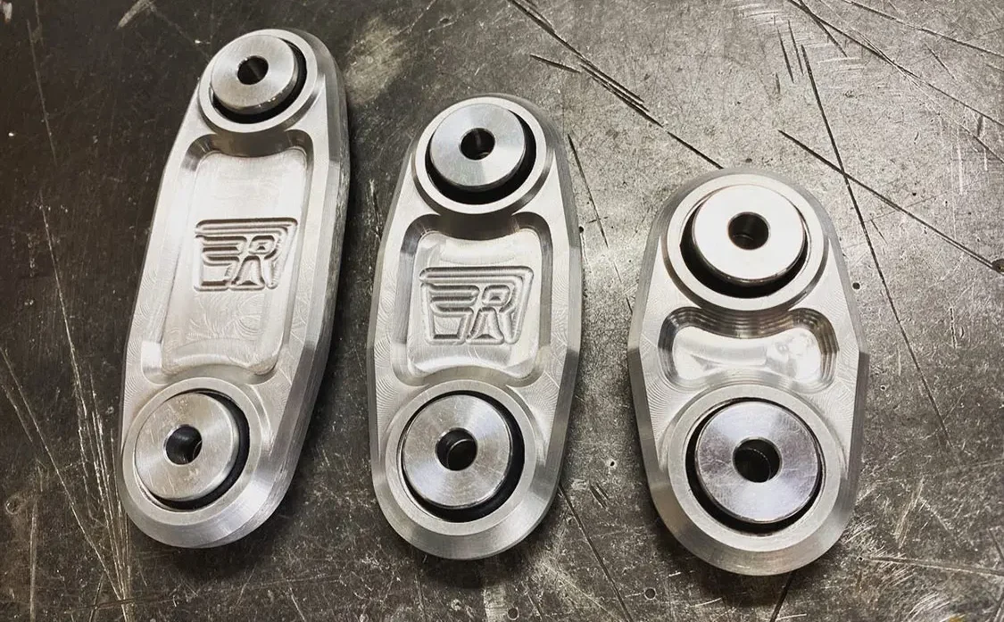 Up next, the company offers these billet exhaust hangers. They come in three sizes—2 inches, 3 inches, and 4 inches—and they come with high-temperature bushing with aluminum inserts with 5/16-inch mounting holes and stainless weld tabs for us with hangers on both the driver side and passenger side.