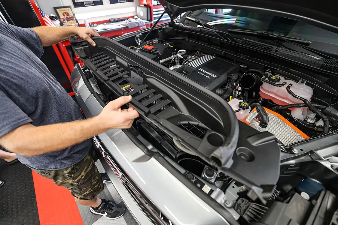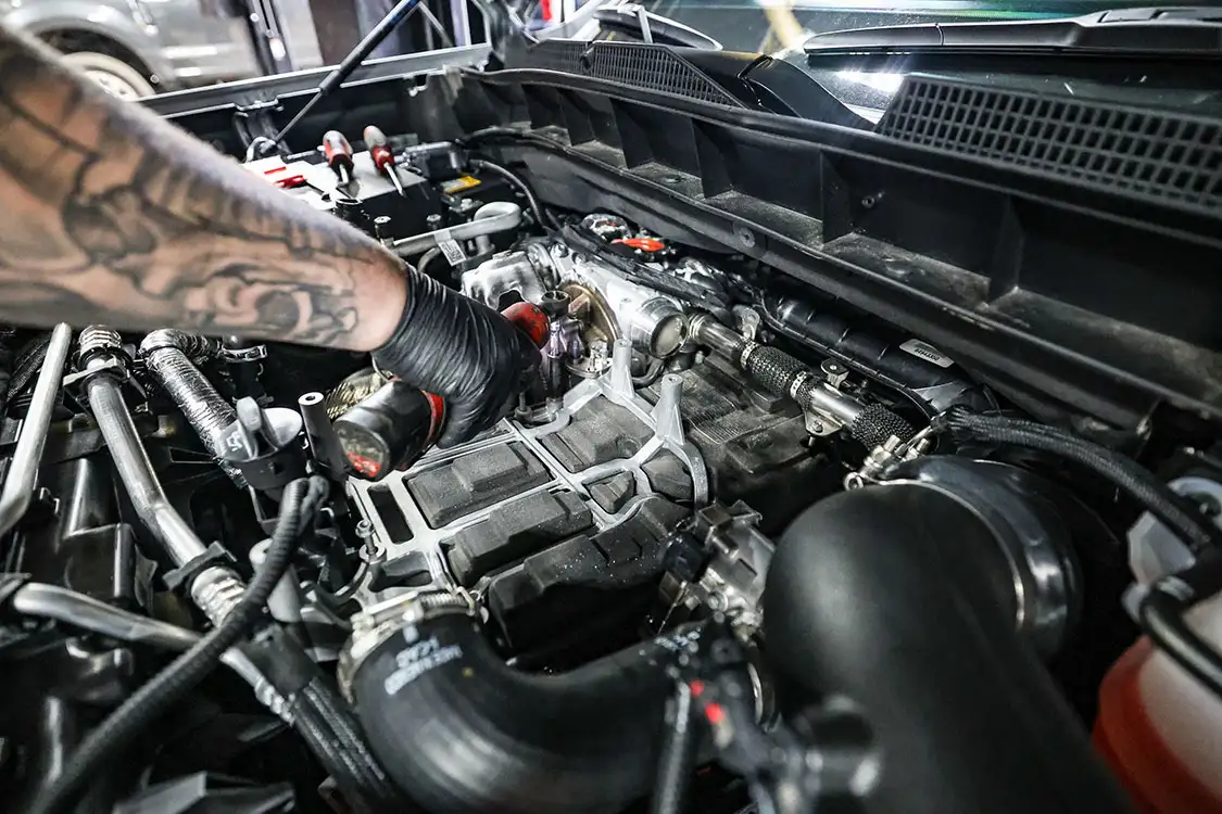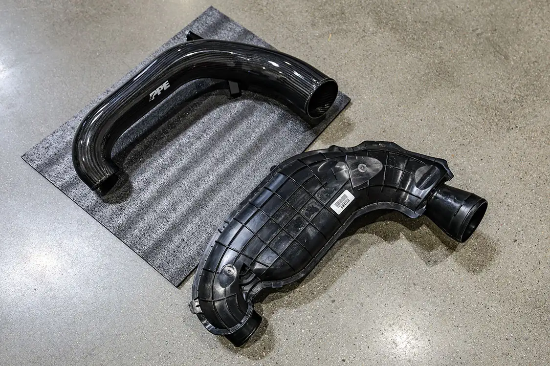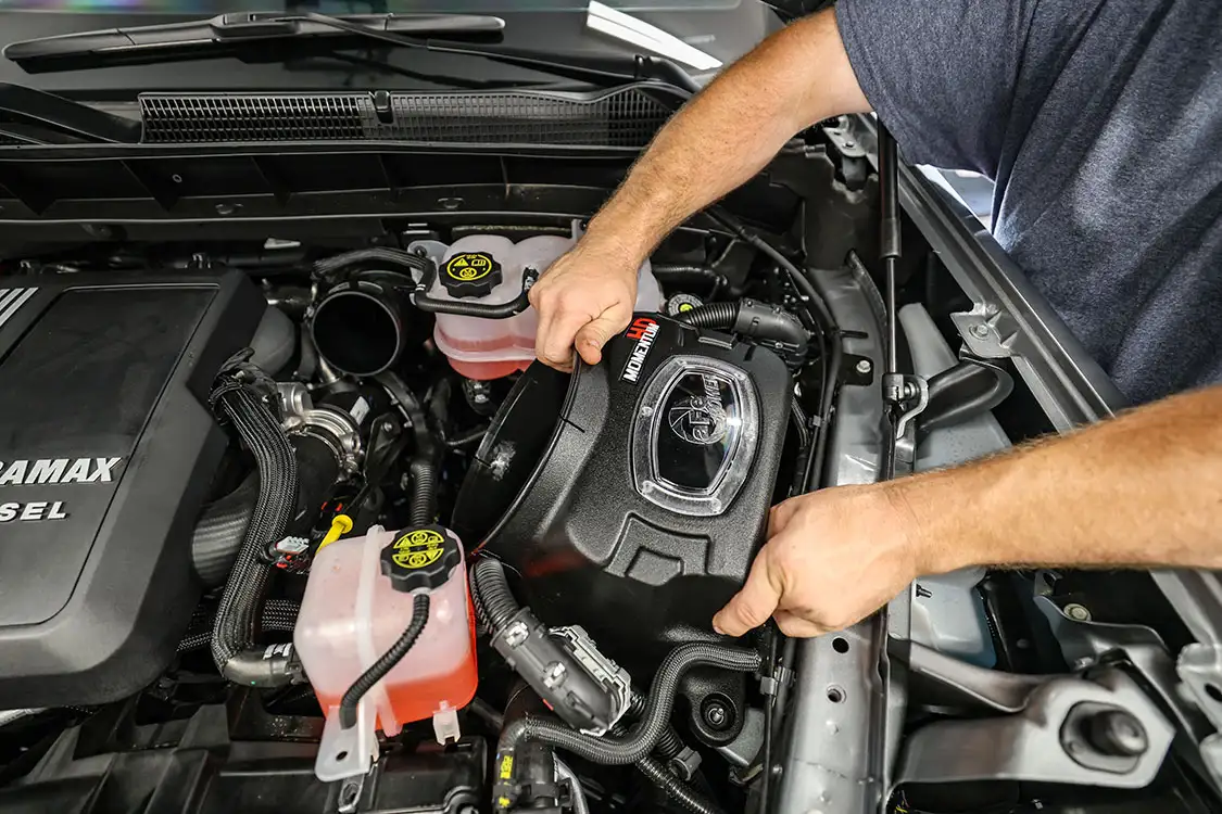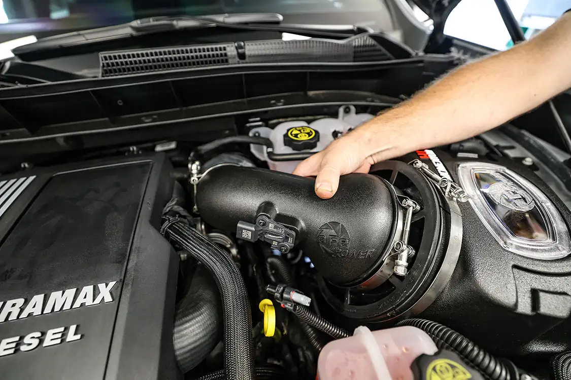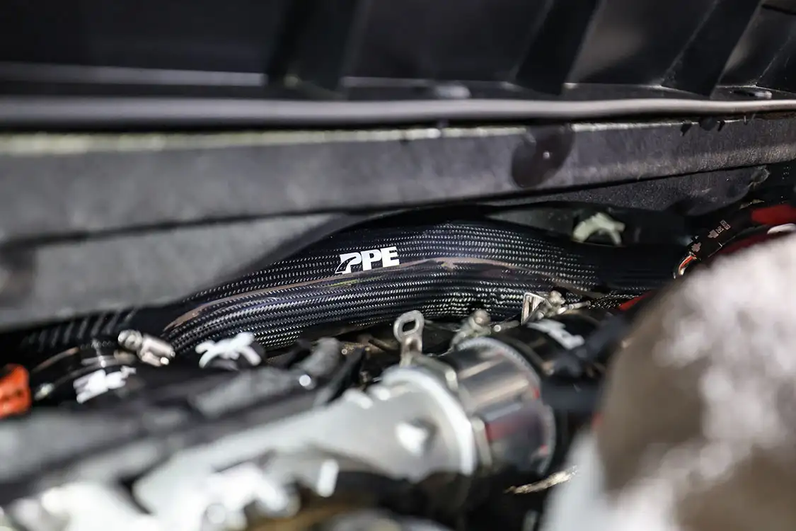 01. The factory engine bay layout has a plastic cover on the small OEM intercooler and a restrictive intake, but that’s about to change.02. The clamps that hold the factory air box lid and tube were loosened and removed.03. The front engine cover was then removed and set aside with all the clips.04. Next, we removed the driver side corner support. This needs to come out to allow clearance for the lower air box to be removed.05. The wiring harness from the side of the lower factory air box assembly was then unclipped from the truck.06. The rubber boots from the factory air box were taken off and installed on the new AFE airbox. These are needed to secure the new air box to the truck.07. The MAF sensor from the factory intake tube was swapped to the new AFE intake tube ensuring it’s in the right direction.08. The new air box was installed into the factory holes the stock box came out of.09. The new air filter was slid into the box.10. The new intake tube was installed and secured to the factory tube and the air box with supplied hardware. The corner brace and front engine cover were reinstalled at this point and the wire harness was secured to the side of the new air box.11. Next up was the PPE air-to-water intercooler. The required hardware as well as a new base bracket come included.12. Next, we removed the factory intercooler cover as well as the NOx sensor and set it aside.13. We then disconnected both inlets into the factory intercooler.14. The hoses were then clamped before removal to keep the coolant spilling to a minimum.15. The entire stock intercooler was removed as one unit.16. As you can see, PPE did a full casting of the new base bracket, so the new intercooler fits as good as the factory one did. A couple of the studs need to be moved over to the new PPE bracket.17. The factory temperature sensors needed to be moved to the PPE intercooler.18. The new PPE base bracket was then installed with factory hardware.19. The new intercooler was installed and all lines were connected with supplied hardware.20. The NOx sensor was reinstalled to the new intercooler with supplied bracket and hardware.21. The overflow tank was filled with the appropriate coolant, the tank was lifted and the bleeder valve was loosened. We kept filling the tank until the coolant flowed out of the bleeder hole.22. Once the air was purged from the intercooler, the bleeder screw was tightened.23. With all of the electrical connections and coolant hoses installed, the new intercooler was good to go.24. The Zilla carbon fiber intake tube wasn’t available when the intake and intercooler were installed, so we had to go back and add it after the fact. If you are installing all these parts at the same time, it will make the process easier, but it’s still not hard adding it later like we did. You can see how much more unrestrictive the new carbon tube is compared to the massive factory tube.25. After removing the two mounting connectors from the factory tube, as well as the AFE intake tube installed in step 10, it was removed with a little finesse. Once removed, we slid the new PPE tube into place where the factory tube was.26. With the new tube in place, we tightened all the supplied hardware to secure it in place. The carbon fiber looks right at home tucked against the firewall too.27. We then reinstalled the AFE intake tube that now goes from the new PPE carbon tube to the air box.28. The AFE 3-inch exhaust completely replaces the factory exhaust with minimal connections and mandrel bends.29. We cut the factory exhaust 3.75 inches behind the rear weld on the exhaust valve, which is just before the factory exhaust hanger.30. We also cut the factory exhaust before the rear axle. This wasn’t required but made the removal of the factory exhaust easier.31. We started with the front connection then moved to the rear, and aligned and tightened the new piping with supplied clamps.32. The new dual black tips I chose for this truck look much better than the factory cut tip ever did. Once everything was tight, we went back through and ensured there were no leaks and adjusted the clamps as needed to eliminate the leaks.