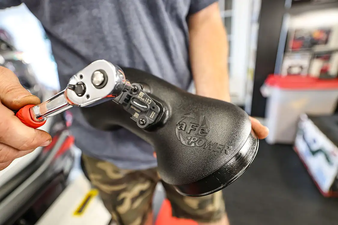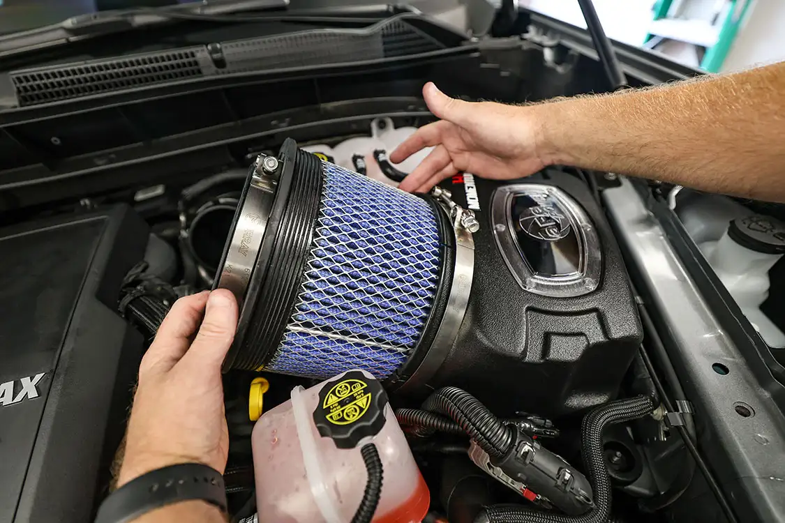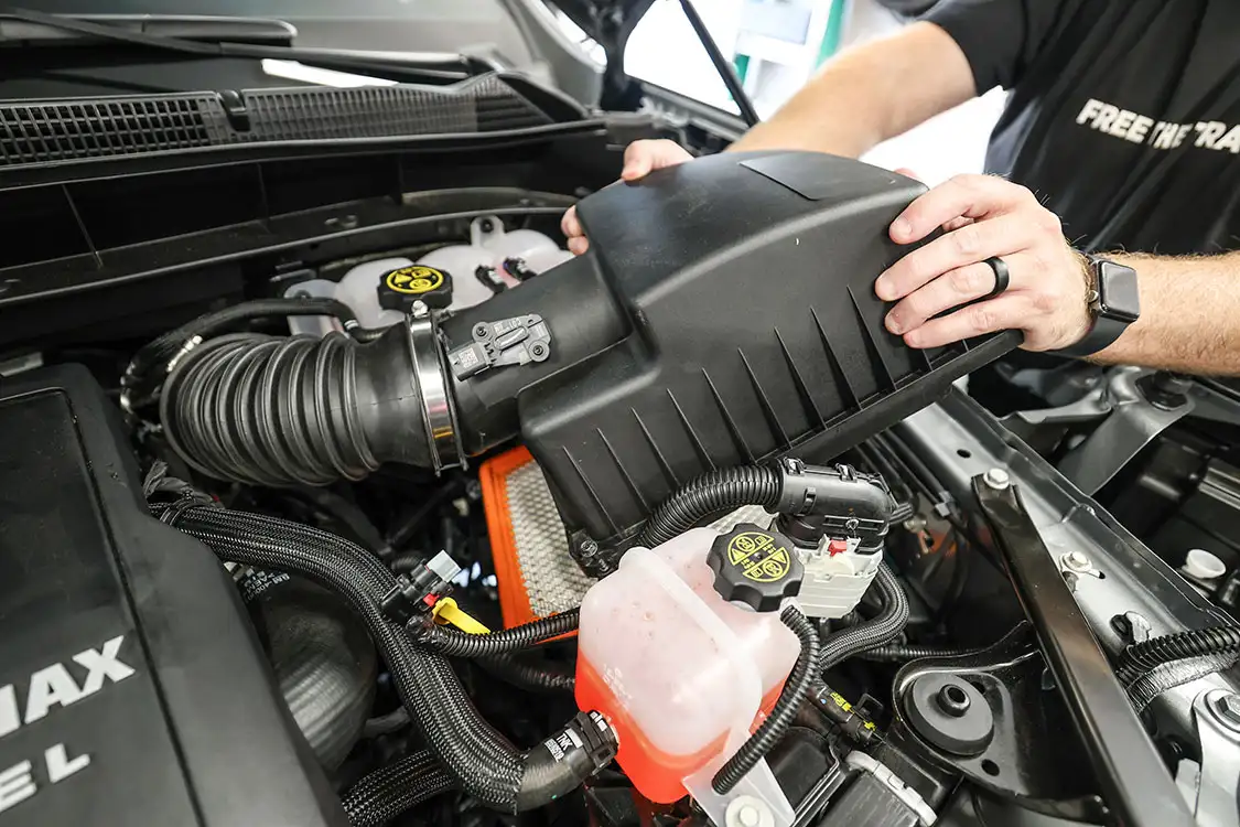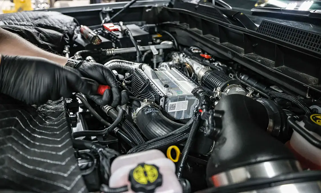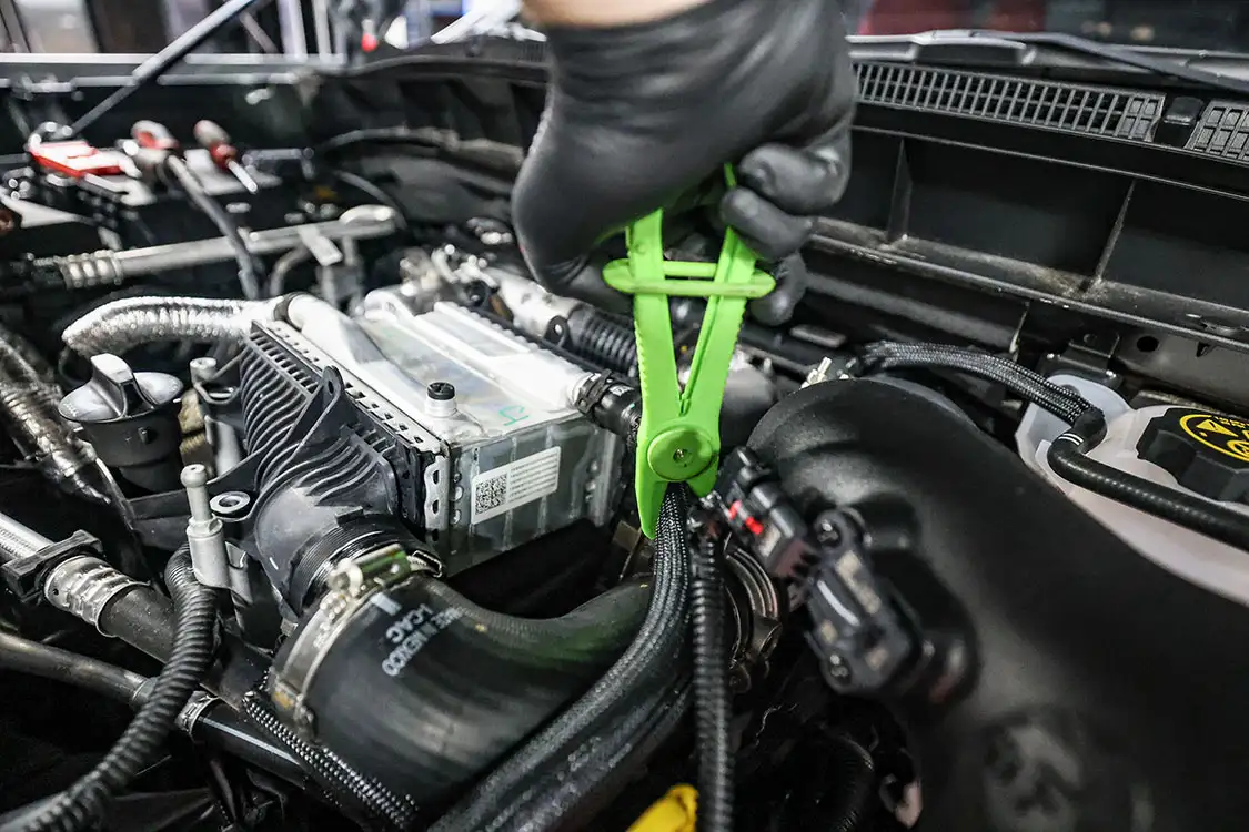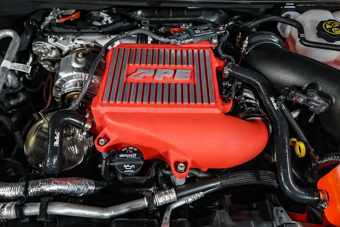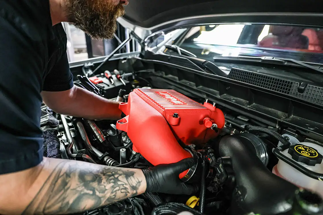 01. The factory engine bay layout has a plastic cover on the small OEM intercooler and a restrictive intake, but that’s about to change.02. The clamps that hold the factory air box lid and tube were loosened and removed.03. The front engine cover was then removed and set aside with all the clips.04. Next, we removed the driver side corner support. This needs to come out to allow clearance for the lower air box to be removed.05. The wiring harness from the side of the lower factory air box assembly was then unclipped from the truck.06. The rubber boots from the factory air box were taken off and installed on the new AFE airbox. These are needed to secure the new air box to the truck.07. The MAF sensor from the factory intake tube was swapped to the new AFE intake tube ensuring it’s in the right direction.08. The new air box was installed into the factory holes the stock box came out of.09. The new air filter was slid into the box.10. The new intake tube was installed and secured to the factory tube and the air box with supplied hardware. The corner brace and front engine cover were reinstalled at this point and the wire harness was secured to the side of the new air box.11. Next up was the PPE air-to-water intercooler. The required hardware as well as a new base bracket come included.12. Next, we removed the factory intercooler cover as well as the NOx sensor and set it aside.13. We then disconnected both inlets into the factory intercooler.14. The hoses were then clamped before removal to keep the coolant spilling to a minimum.15. The entire stock intercooler was removed as one unit.16. As you can see, PPE did a full casting of the new base bracket, so the new intercooler fits as good as the factory one did. A couple of the studs need to be moved over to the new PPE bracket.17. The factory temperature sensors needed to be moved to the PPE intercooler.18. The new PPE base bracket was then installed with factory hardware.19. The new intercooler was installed and all lines were connected with supplied hardware.20. The NOx sensor was reinstalled to the new intercooler with supplied bracket and hardware.21. The overflow tank was filled with the appropriate coolant, the tank was lifted and the bleeder valve was loosened. We kept filling the tank until the coolant flowed out of the bleeder hole.22. Once the air was purged from the intercooler, the bleeder screw was tightened.23. With all of the electrical connections and coolant hoses installed, the new intercooler was good to go.24. The Zilla carbon fiber intake tube wasn’t available when the intake and intercooler were installed, so we had to go back and add it after the fact. If you are installing all these parts at the same time, it will make the process easier, but it’s still not hard adding it later like we did. You can see how much more unrestrictive the new carbon tube is compared to the massive factory tube.25. After removing the two mounting connectors from the factory tube, as well as the AFE intake tube installed in step 10, it was removed with a little finesse. Once removed, we slid the new PPE tube into place where the factory tube was.26. With the new tube in place, we tightened all the supplied hardware to secure it in place. The carbon fiber looks right at home tucked against the firewall too.27. We then reinstalled the AFE intake tube that now goes from the new PPE carbon tube to the air box.28. The AFE 3-inch exhaust completely replaces the factory exhaust with minimal connections and mandrel bends.29. We cut the factory exhaust 3.75 inches behind the rear weld on the exhaust valve, which is just before the factory exhaust hanger.30. We also cut the factory exhaust before the rear axle. This wasn’t required but made the removal of the factory exhaust easier.31. We started with the front connection then moved to the rear, and aligned and tightened the new piping with supplied clamps.32. The new dual black tips I chose for this truck look much better than the factory cut tip ever did. Once everything was tight, we went back through and ensured there were no leaks and adjusted the clamps as needed to eliminate the leaks.