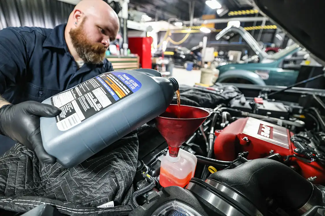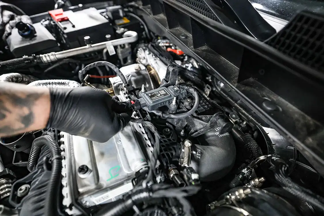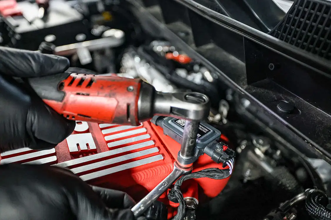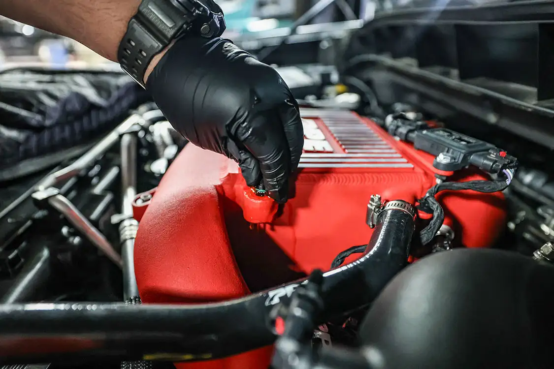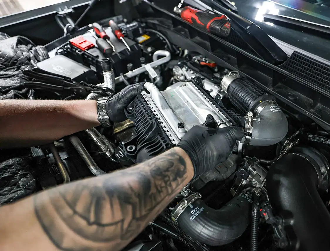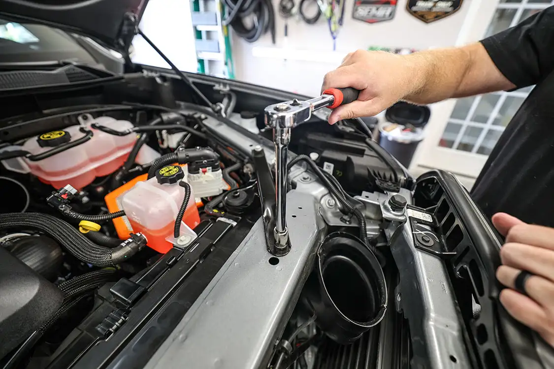 01. The factory engine bay layout has a plastic cover on the small OEM intercooler and a restrictive intake, but that’s about to change.02. The clamps that hold the factory air box lid and tube were loosened and removed.03. The front engine cover was then removed and set aside with all the clips.04. Next, we removed the driver side corner support. This needs to come out to allow clearance for the lower air box to be removed.05. The wiring harness from the side of the lower factory air box assembly was then unclipped from the truck.06. The rubber boots from the factory air box were taken off and installed on the new AFE airbox. These are needed to secure the new air box to the truck.07. The MAF sensor from the factory intake tube was swapped to the new AFE intake tube ensuring it’s in the right direction.08. The new air box was installed into the factory holes the stock box came out of.09. The new air filter was slid into the box.10. The new intake tube was installed and secured to the factory tube and the air box with supplied hardware. The corner brace and front engine cover were reinstalled at this point and the wire harness was secured to the side of the new air box.11. Next up was the PPE air-to-water intercooler. The required hardware as well as a new base bracket come included.12. Next, we removed the factory intercooler cover as well as the NOx sensor and set it aside.13. We then disconnected both inlets into the factory intercooler.14. The hoses were then clamped before removal to keep the coolant spilling to a minimum.15. The entire stock intercooler was removed as one unit.16. As you can see, PPE did a full casting of the new base bracket, so the new intercooler fits as good as the factory one did. A couple of the studs need to be moved over to the new PPE bracket.17. The factory temperature sensors needed to be moved to the PPE intercooler.18. The new PPE base bracket was then installed with factory hardware.19. The new intercooler was installed and all lines were connected with supplied hardware.20. The NOx sensor was reinstalled to the new intercooler with supplied bracket and hardware.21. The overflow tank was filled with the appropriate coolant, the tank was lifted and the bleeder valve was loosened. We kept filling the tank until the coolant flowed out of the bleeder hole.22. Once the air was purged from the intercooler, the bleeder screw was tightened.23. With all of the electrical connections and coolant hoses installed, the new intercooler was good to go.24. The Zilla carbon fiber intake tube wasn’t available when the intake and intercooler were installed, so we had to go back and add it after the fact. If you are installing all these parts at the same time, it will make the process easier, but it’s still not hard adding it later like we did. You can see how much more unrestrictive the new carbon tube is compared to the massive factory tube.25. After removing the two mounting connectors from the factory tube, as well as the AFE intake tube installed in step 10, it was removed with a little finesse. Once removed, we slid the new PPE tube into place where the factory tube was.26. With the new tube in place, we tightened all the supplied hardware to secure it in place. The carbon fiber looks right at home tucked against the firewall too.27. We then reinstalled the AFE intake tube that now goes from the new PPE carbon tube to the air box.28. The AFE 3-inch exhaust completely replaces the factory exhaust with minimal connections and mandrel bends.29. We cut the factory exhaust 3.75 inches behind the rear weld on the exhaust valve, which is just before the factory exhaust hanger.30. We also cut the factory exhaust before the rear axle. This wasn’t required but made the removal of the factory exhaust easier.31. We started with the front connection then moved to the rear, and aligned and tightened the new piping with supplied clamps.32. The new dual black tips I chose for this truck look much better than the factory cut tip ever did. Once everything was tight, we went back through and ensured there were no leaks and adjusted the clamps as needed to eliminate the leaks.