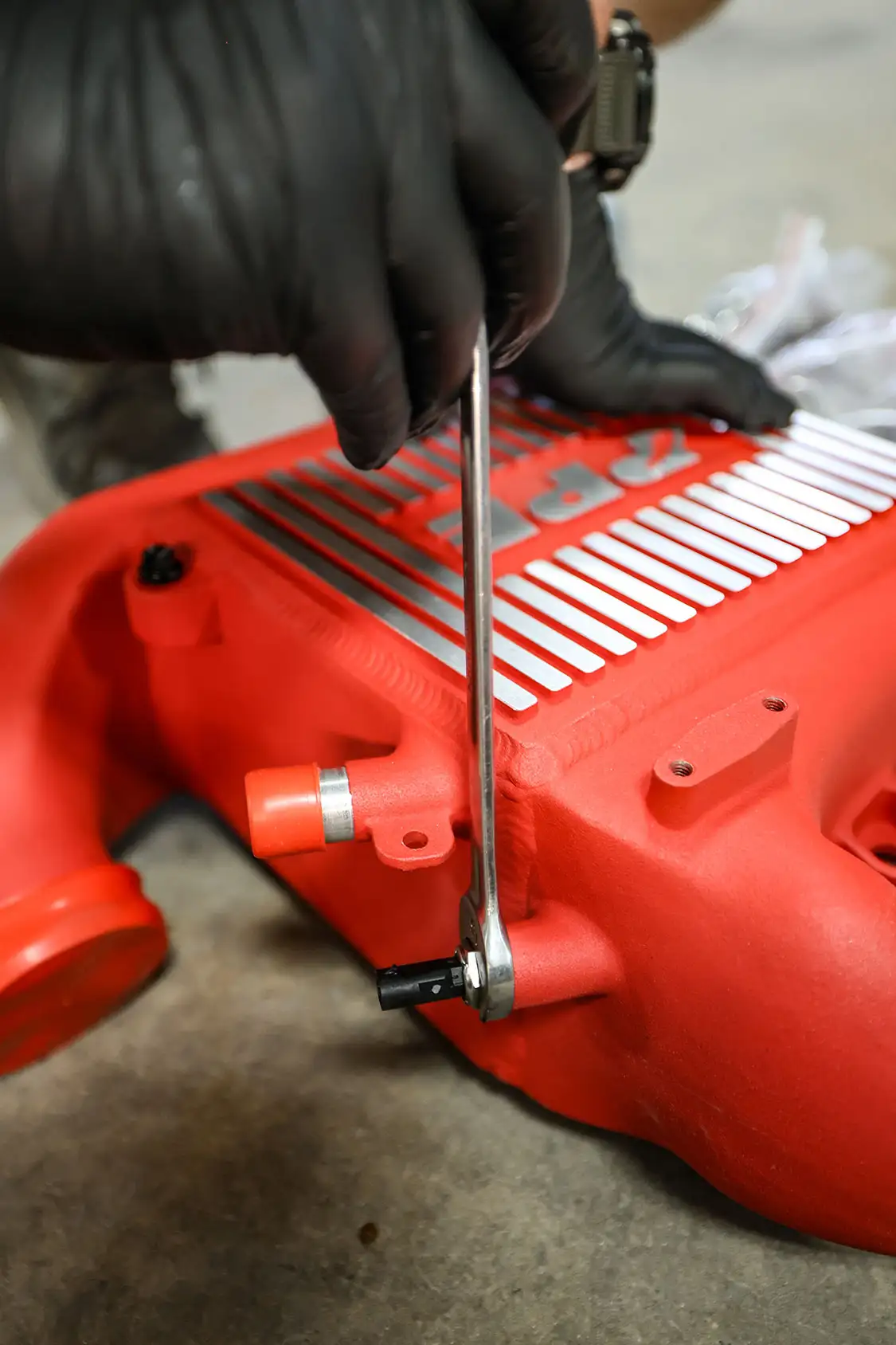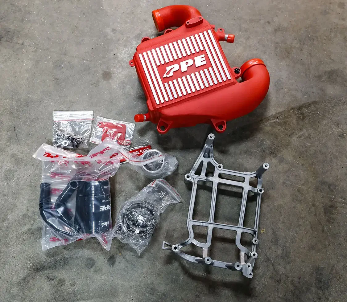 Now that air flow into the engine was improved, it was time to better cool the air than than the factory setup. The PPE air-to-water intercooler was added (Part #15030012 with a $1,600 retail). This not only provided cooler air for the turbo, but being the color theme with this truck was red, it also added a touch of color matching to the engine bay.