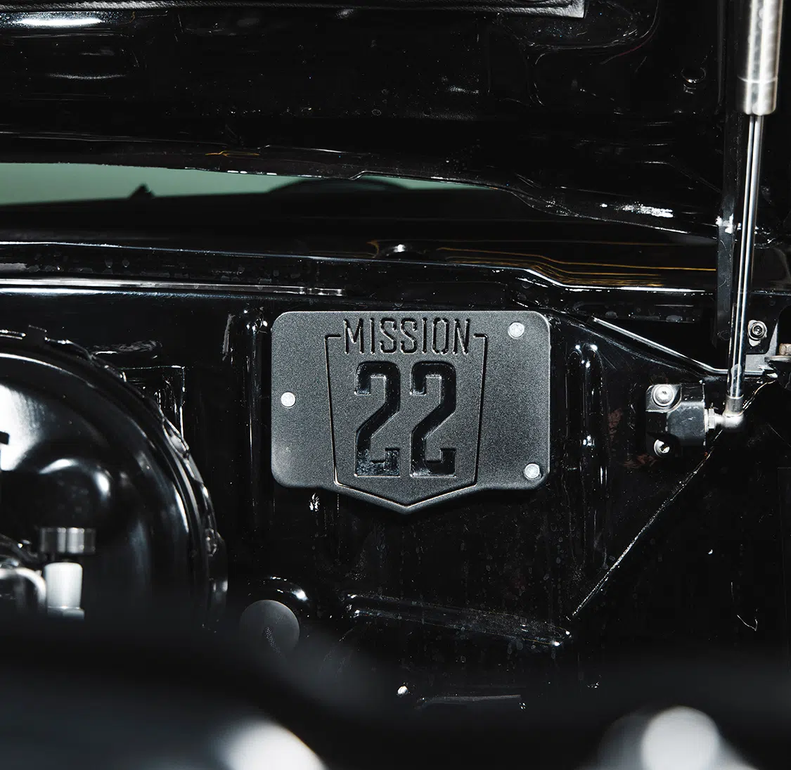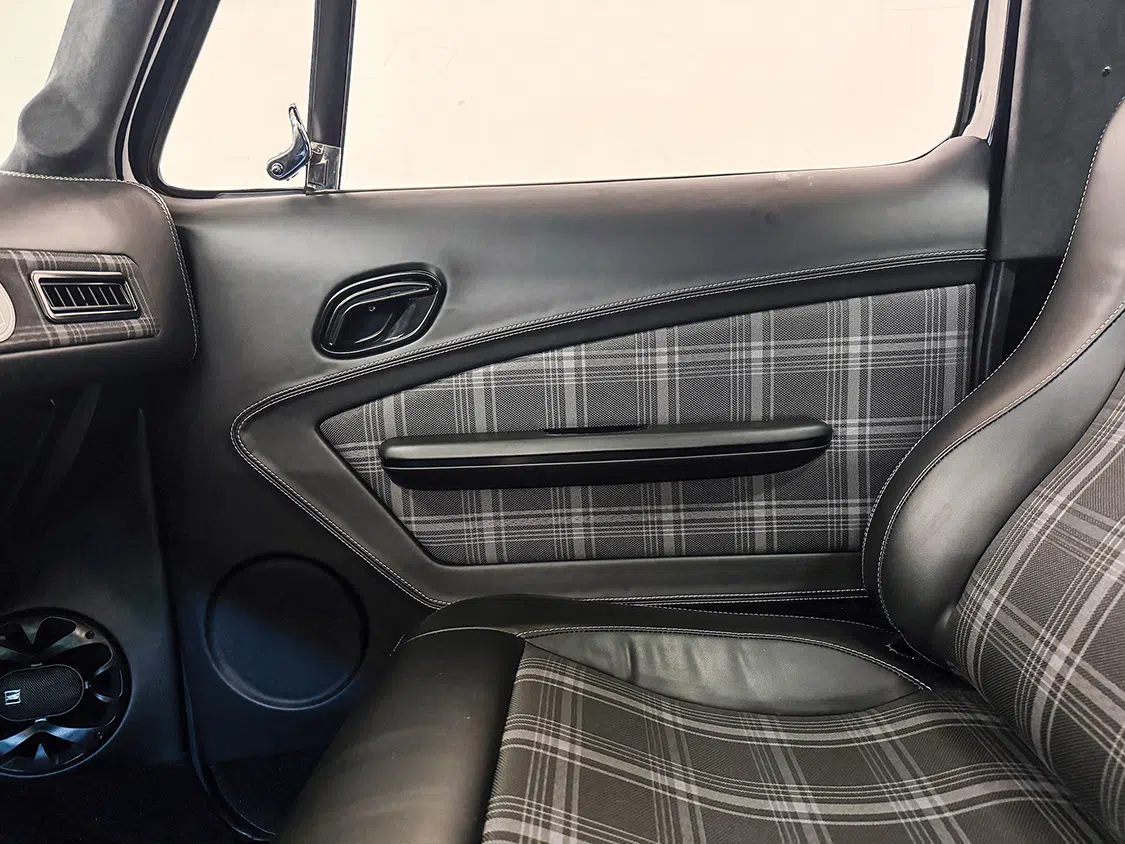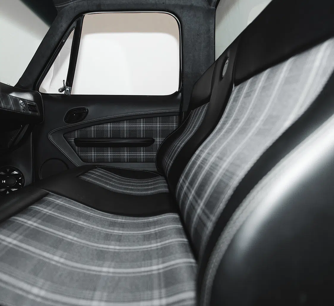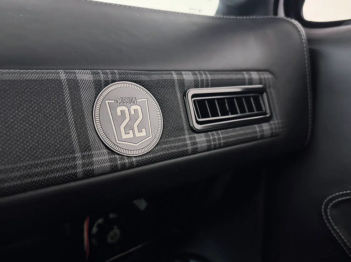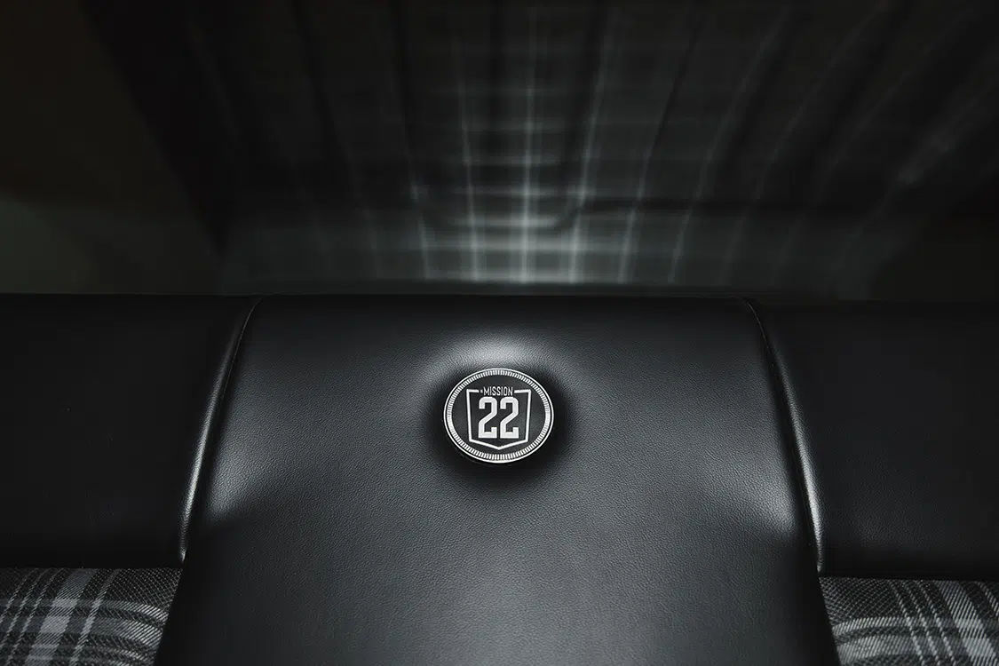 Fesler USA’s custom interior redefines luxury, featuring black leather with gray and black plaid inserts. Mission 22 badges embedded in the bench seat, door panels, and dash remind us of the project’s noble cause. Twisted Artisan professionally installed these components, including the dash overlay, door panels, A-pillar panels, one-piece headliner, and rear-side upper panels, creating a seamless and sophisticated environment.