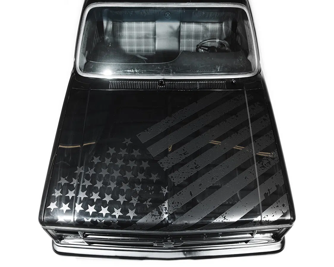 The final bodywork and paint, executed by Shane from Street Dreams Paint Shop, brought the truck’s exterior to life. The aluminum bedcover from Pro’s Pick, wrapped in black gloss vinyl with sponsor graphics, and the distorted American flag vinyl on the hood, add striking visual appeal.