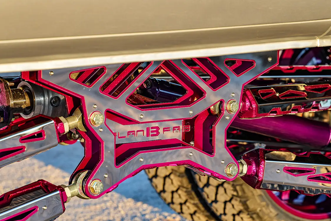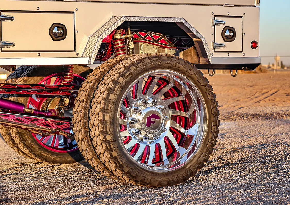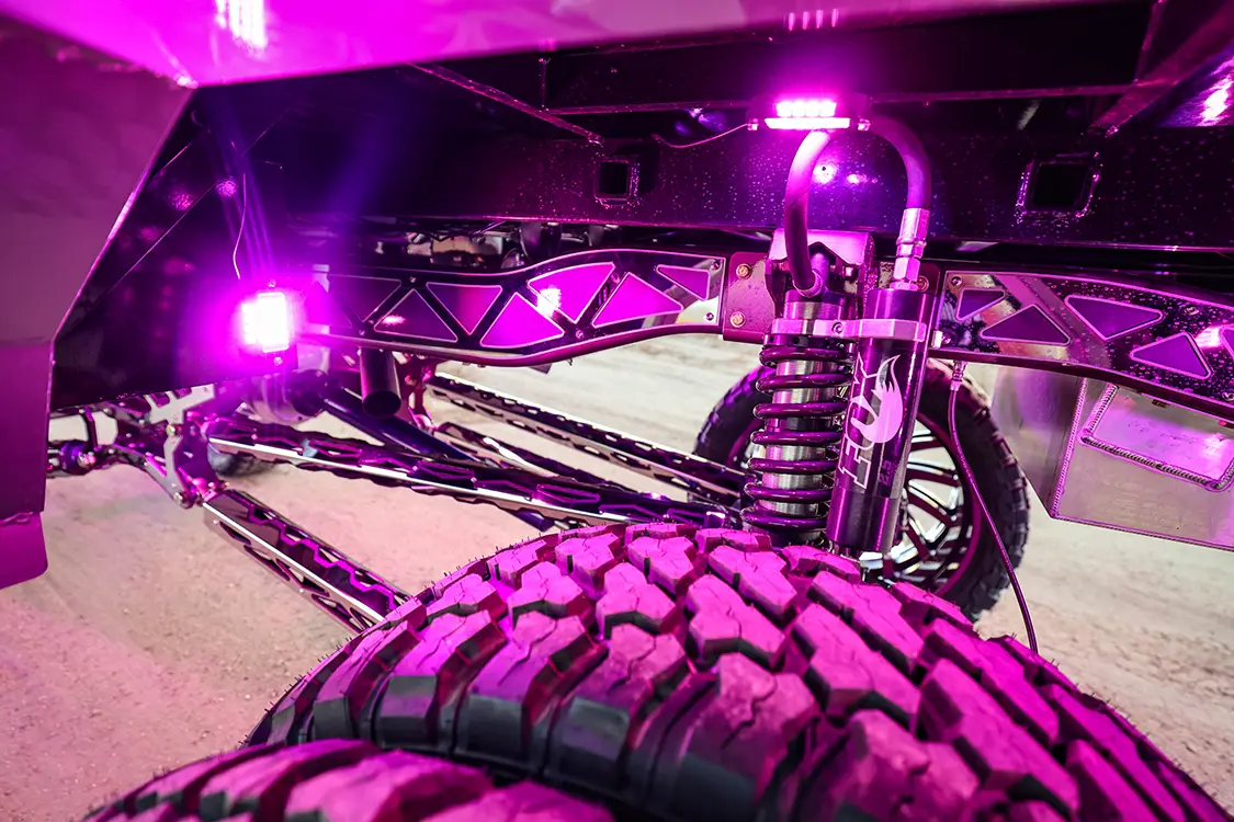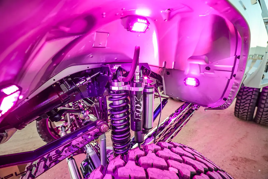 Knowing the truck had to have a massive presence, the first thing Mario did was drop the frame for the truck off with Rob down at Plan B Fab to build a custom chassis with 16 inches of lift, a custom 4-link, and a ton of Prismatic Illusion Purple powdercoating and polished overlays. Fox 2.5 reservoir coilovers and Ruthless Fabrication triple bypass shocks were used to make it ride good, while Ruthless Fab dual steering stabilizers were used to make it steer as smooth as stock. The axles were swapped for 2017 Ford F-350 units, and the rear of the truck was converted to a dually to add even more presence. For rolling attire, 30×8.5-inch Forgiato ‘Wade’ wheels were selected and wrapped in 42×13.50-30 Fury Country Hunter tires. To make this custom chassis work stand out at night, a total of twenty-six Infinite off-road rock lights were wired in.
